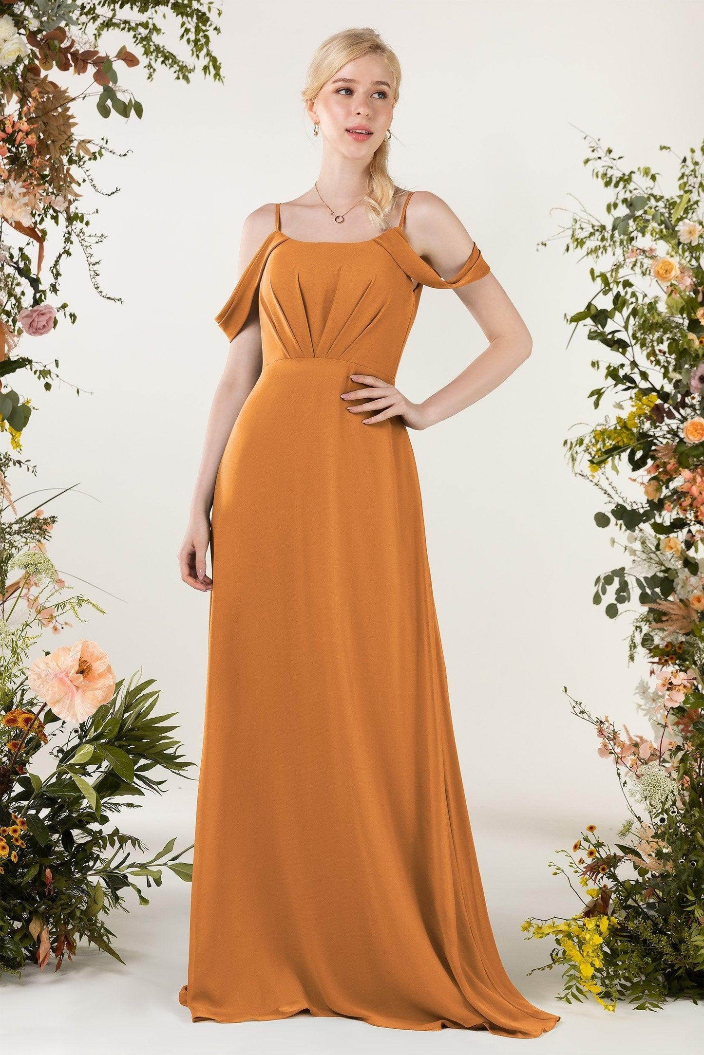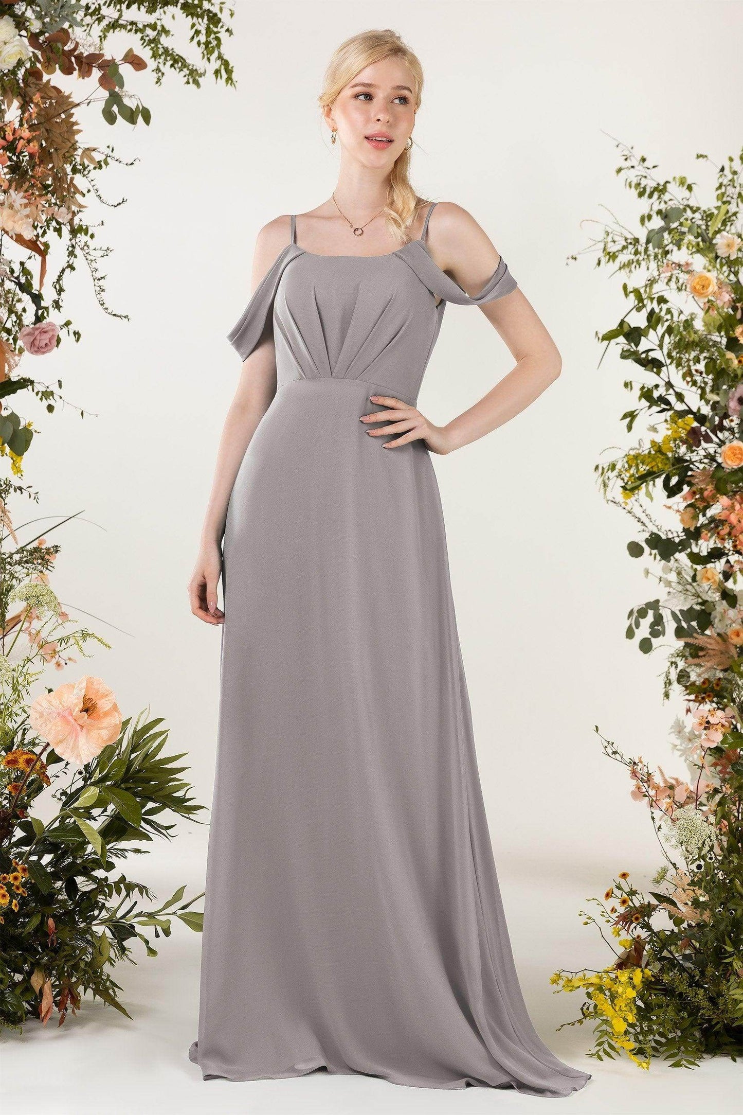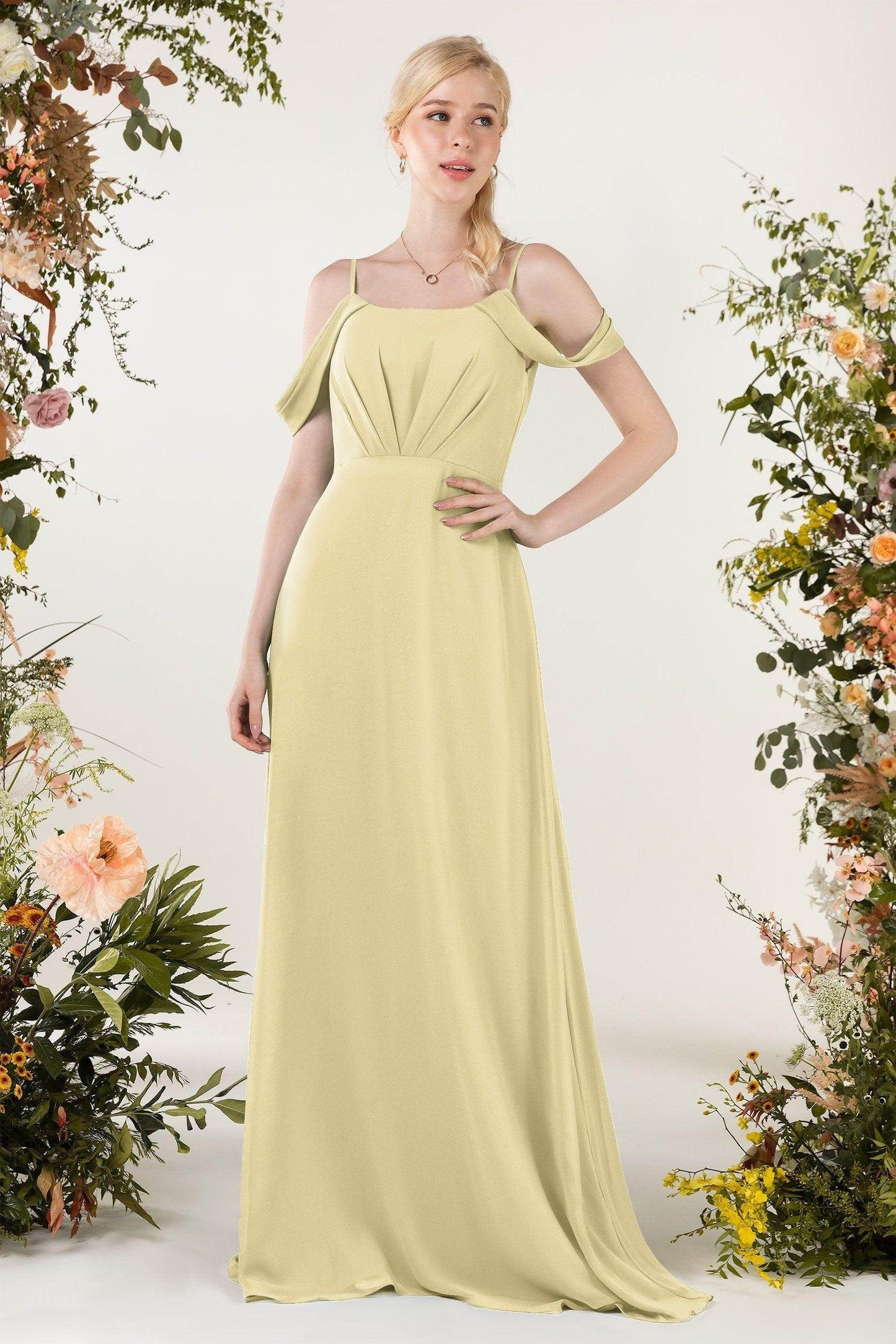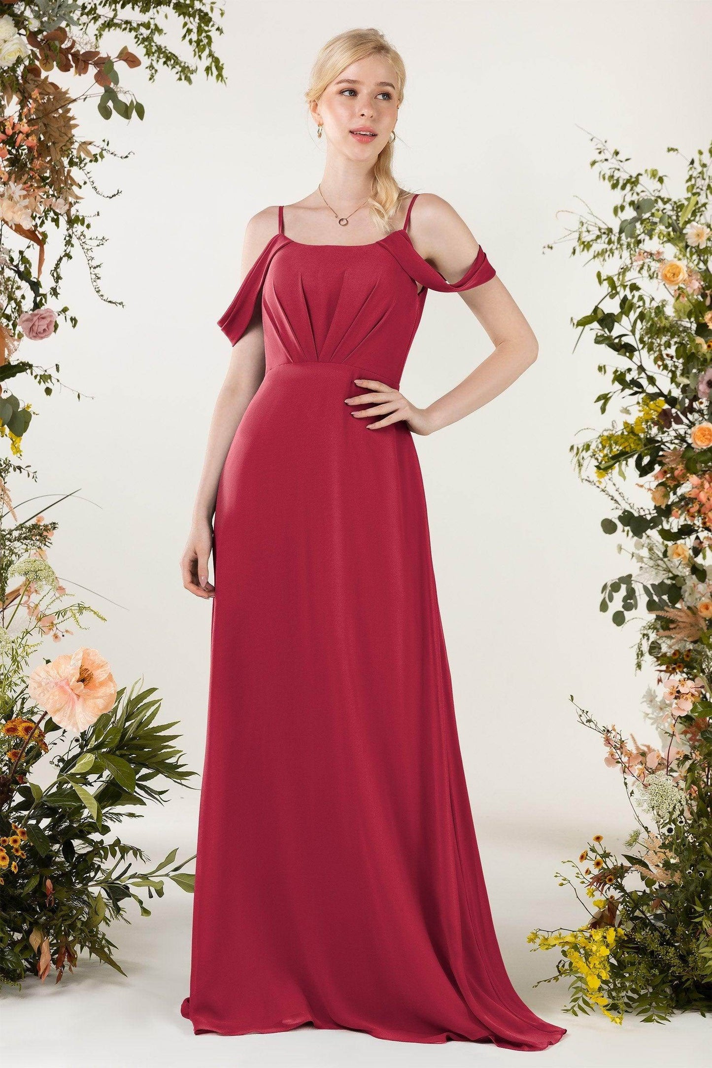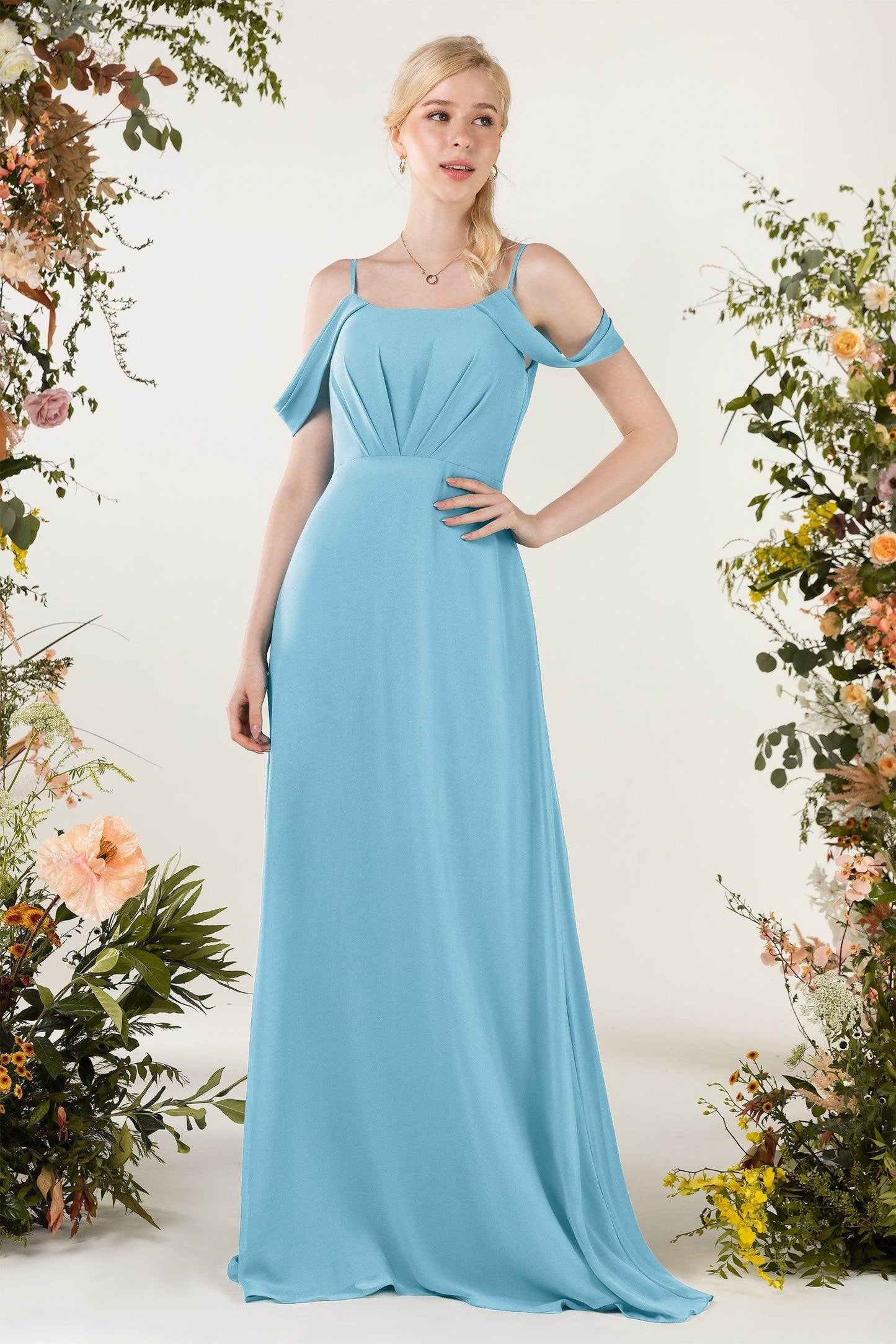 This bridesmaid dress combines elegance and practicality with light chiffon, spaghetti straps, and a sleek column silhouette. The flowing skirt, detailed pleats, and functional pockets add style, while the back zipper ensures a perfect fit.