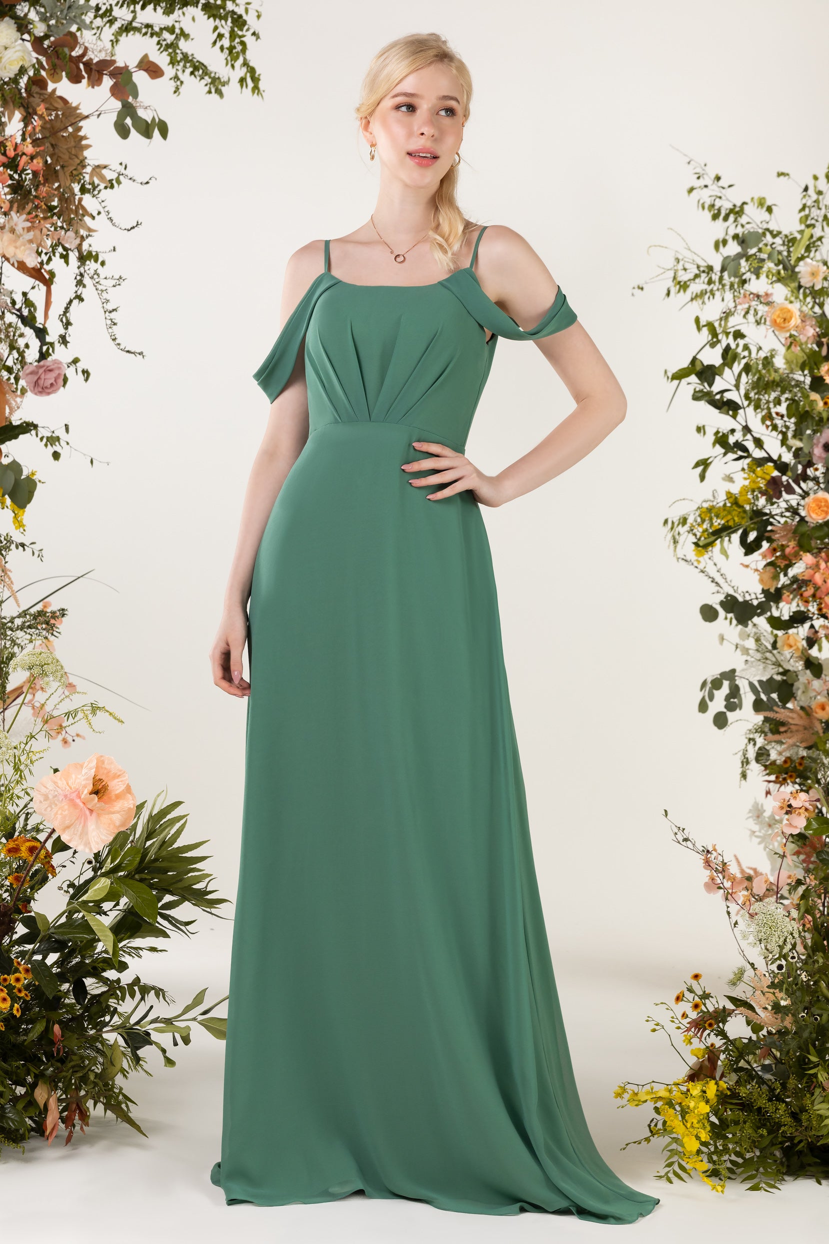 This bridesmaid dress combines elegance and practicality with light chiffon, spaghetti straps, and a sleek column silhouette. The flowing skirt, detailed pleats, and functional pockets add style, while the back zipper ensures a perfect fit.