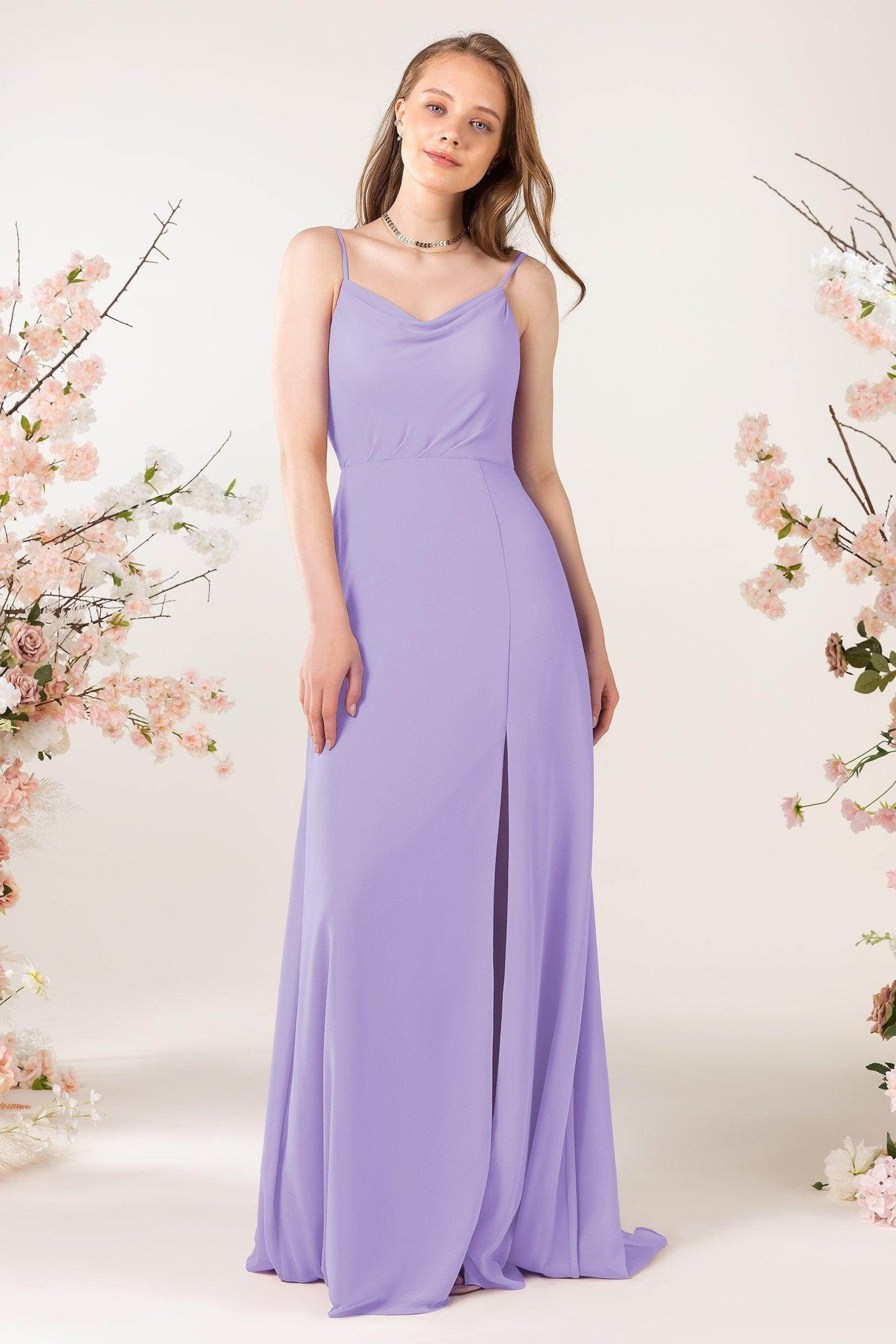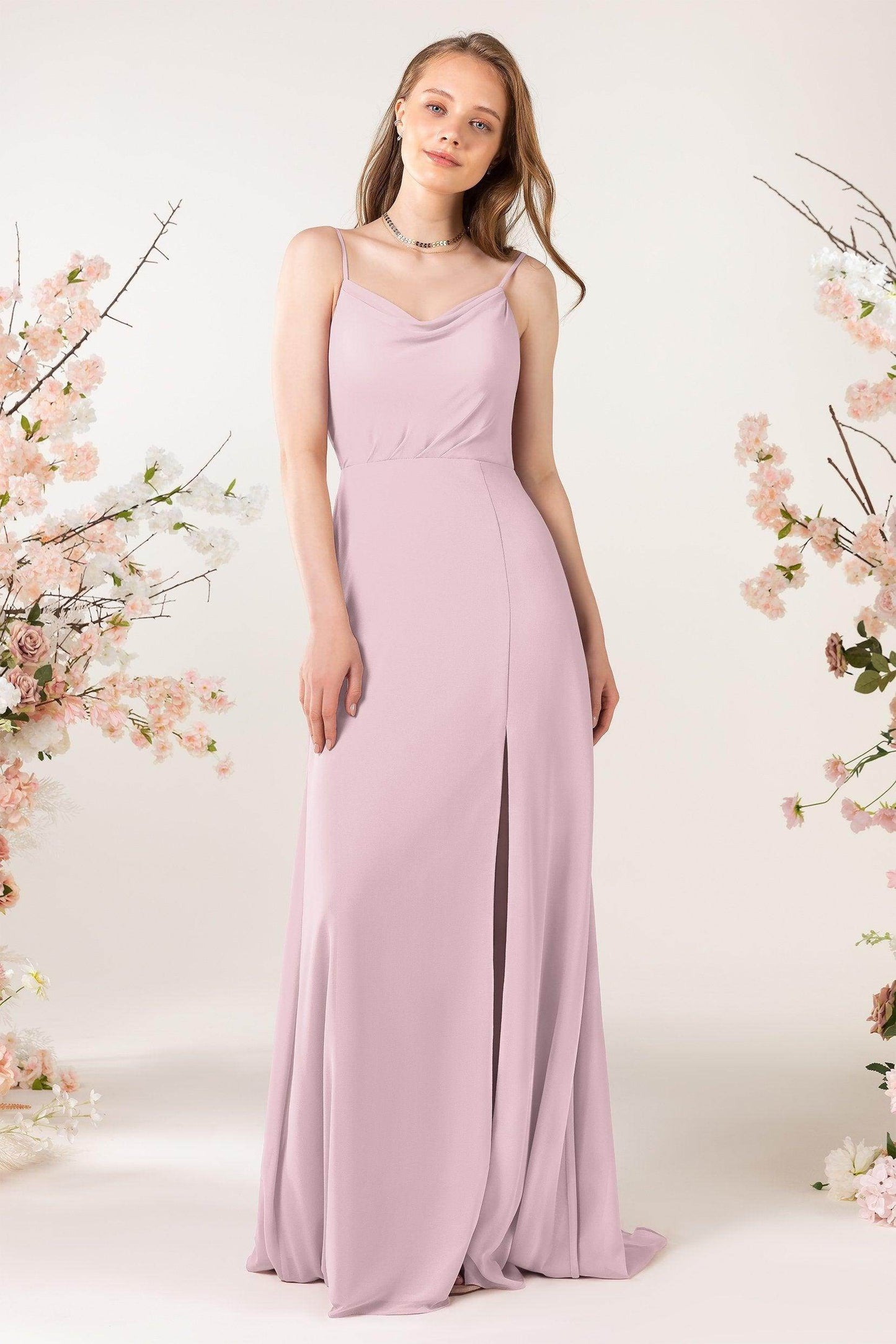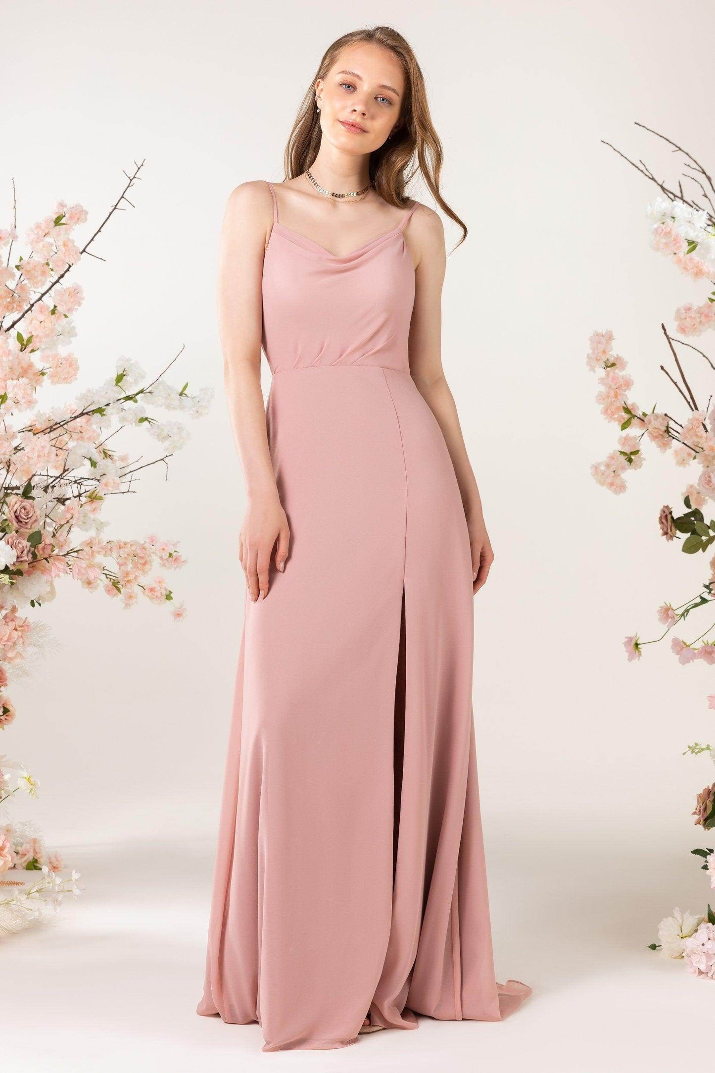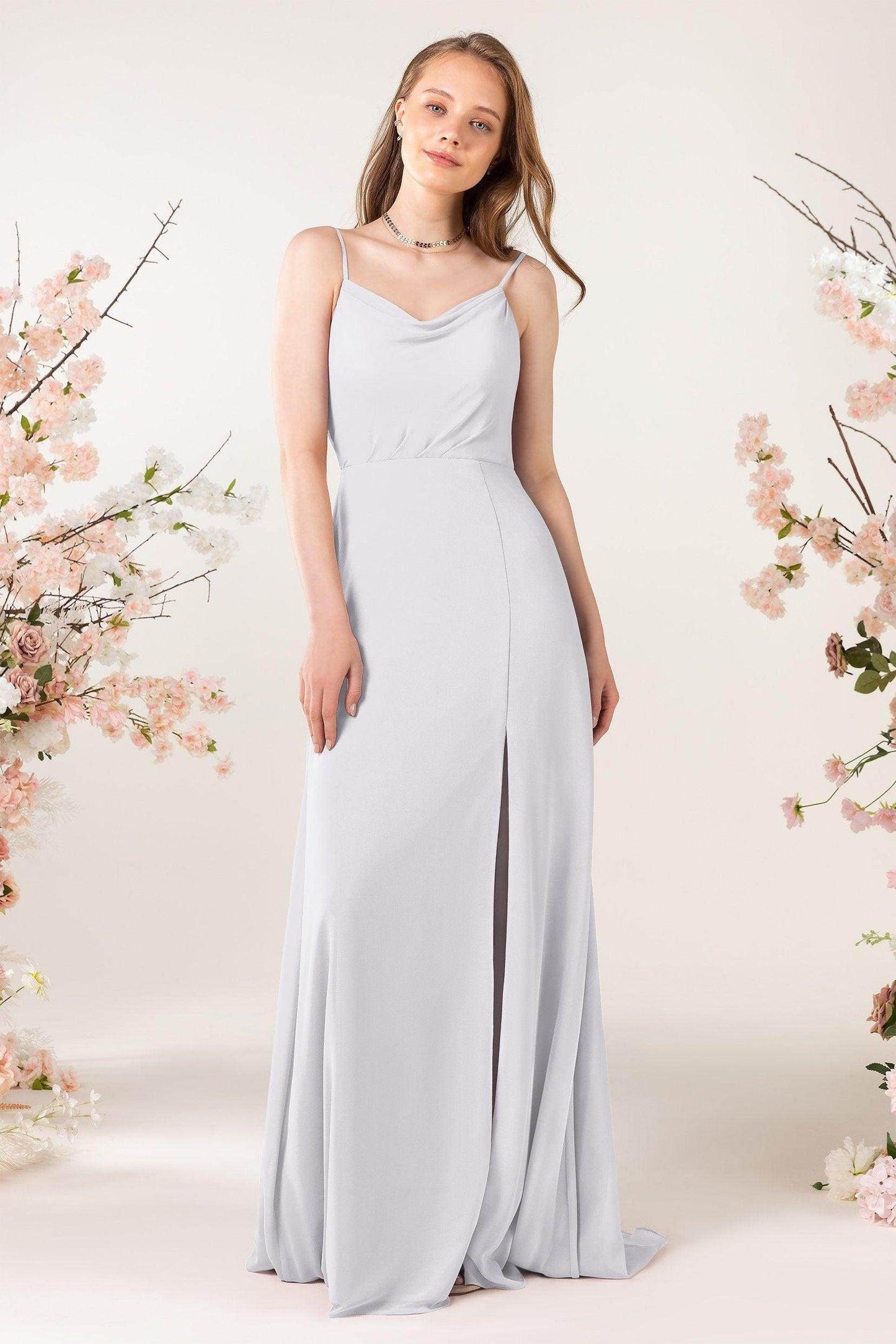 This bridesmaid dress combines modern elegance with sophisticated details. The back zipper is practical yet refined, while airy chiffon and a split skirt add chic flair. Spaghetti straps and a sheath silhouette highlight a flattering, dreamy look with a sweep train, perfect for any bridesmaid.