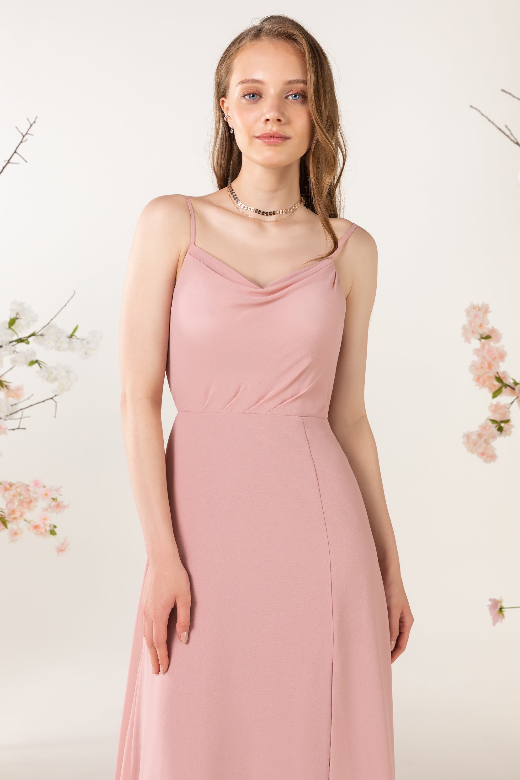 This bridesmaid dress combines modern elegance with sophisticated details. The back zipper is practical yet refined, while airy chiffon and a split skirt add chic flair. Spaghetti straps and a sheath silhouette highlight a flattering, dreamy look with a sweep train, perfect for any bridesmaid.
