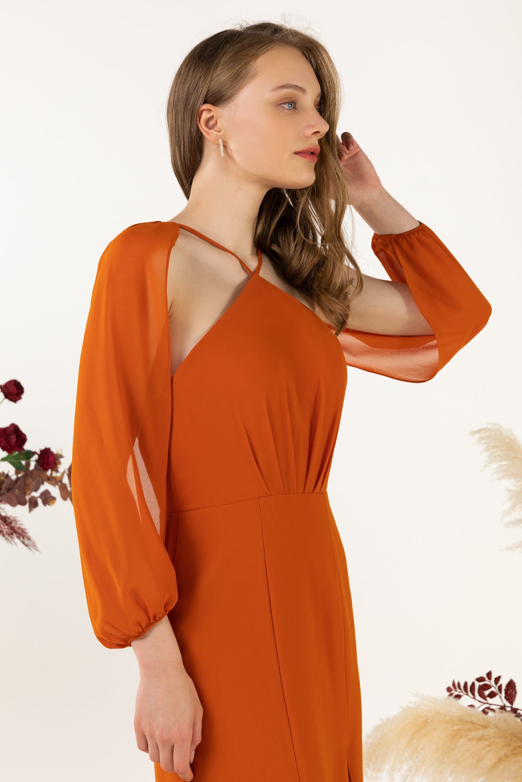 This bridesmaid dress blends elegance and modernity. Soft chiffon and a halter neckline add allure, while long sleeves offer grace and comfort. The sheath cut and natural waist highlight a slender figure, with a sweeping train featuring pleats and a split for added sophistication. A back zipper ensures a flawless fit.