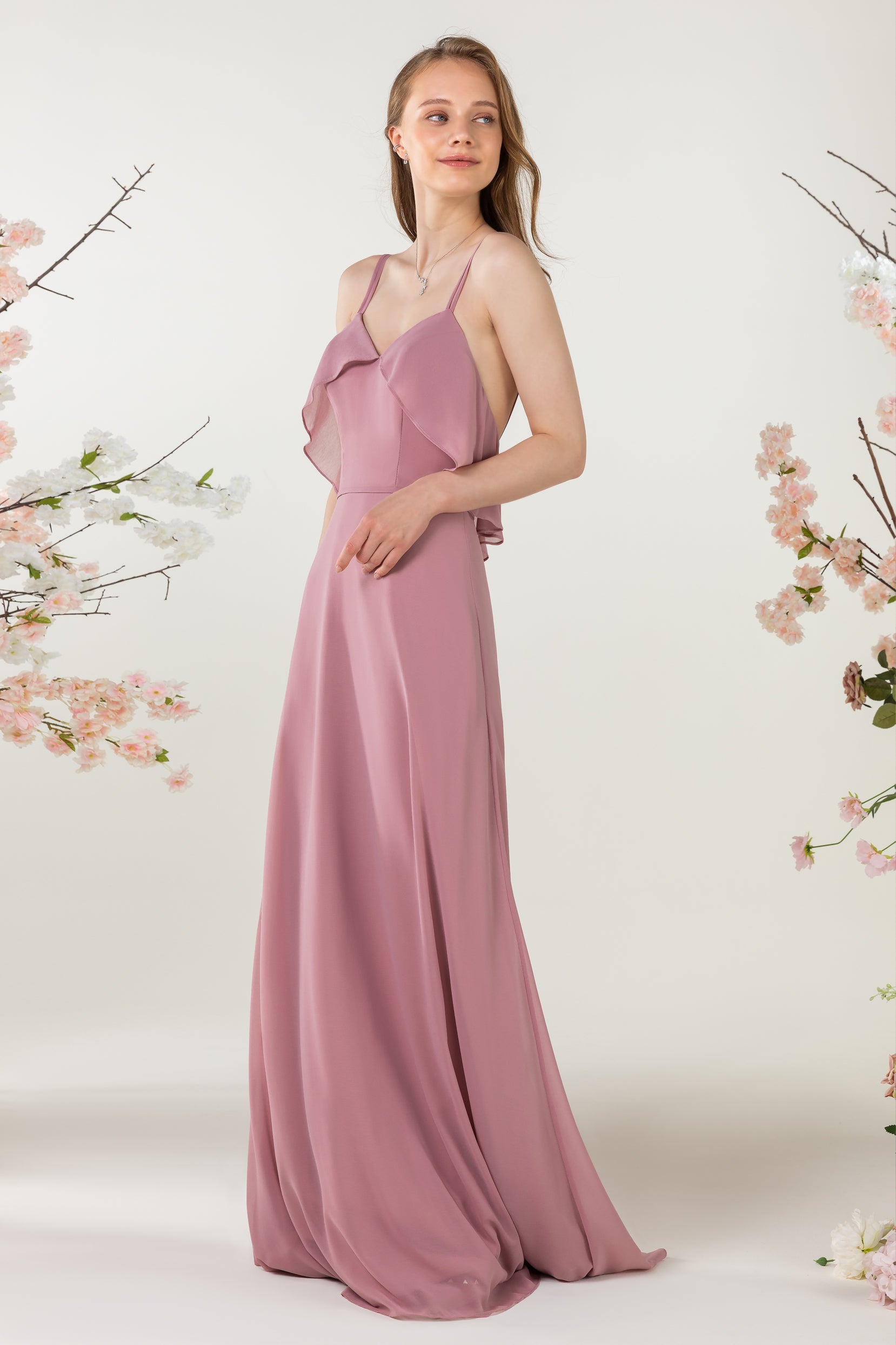 This bridesmaid dress combines elegance and romance. With a chic back zipper and flowing chiffon, it features spaghetti straps and a sheath cut for a sleek look. Ruffles and a sweep train add dreamy charm, while the natural waistline highlights a graceful silhouette.