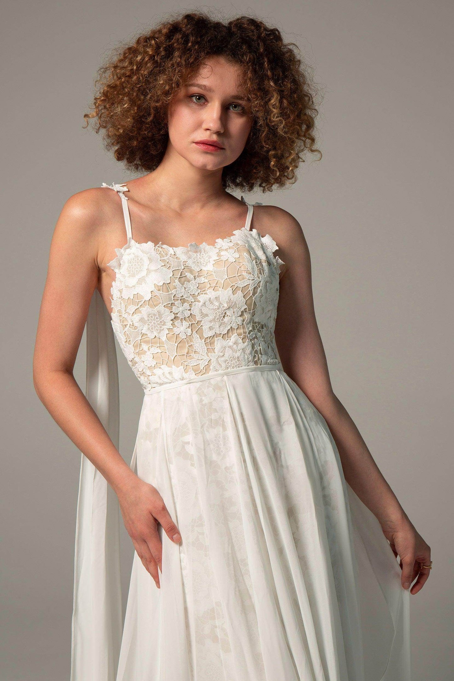 Discover elegance with the BELLAMY beach wedding dress in ivory, featuring delicate appliques and a captivating split. Perfect for hotel, church, garden, and hall weddings, its chic cape effect adds romance for beach ceremonies!