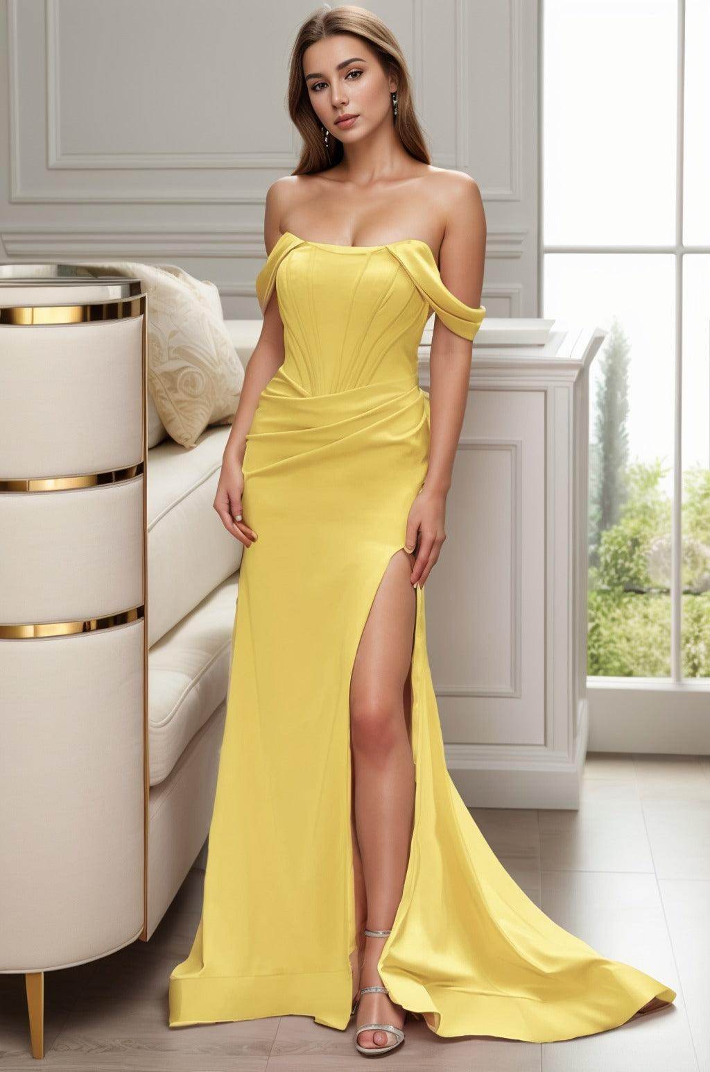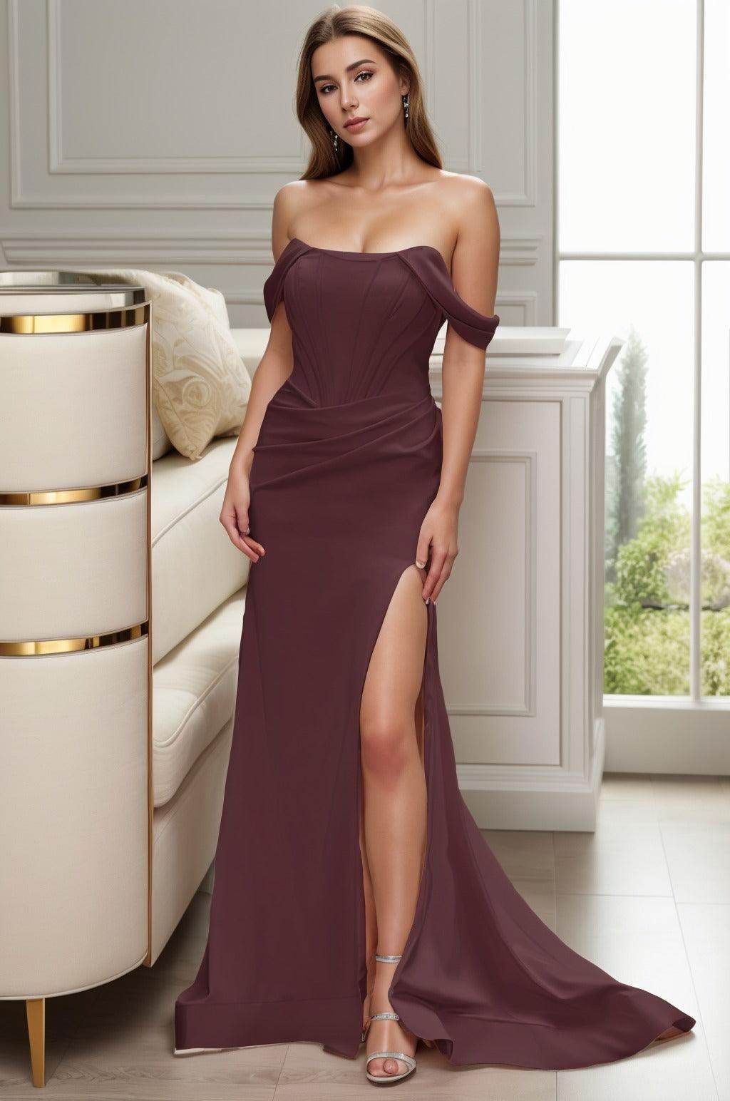 Elevate your style with our latest Prom gown, a chic Sheath-Column silhouette with a captivating Off-The-Shoulder neckline. Designed for sophistication, it features a natural waist, sweeping Brush Train, and zipper detail for a seamless fit. Crafted from luxurious Elastic Cloth, it exudes elegance for any occasion.