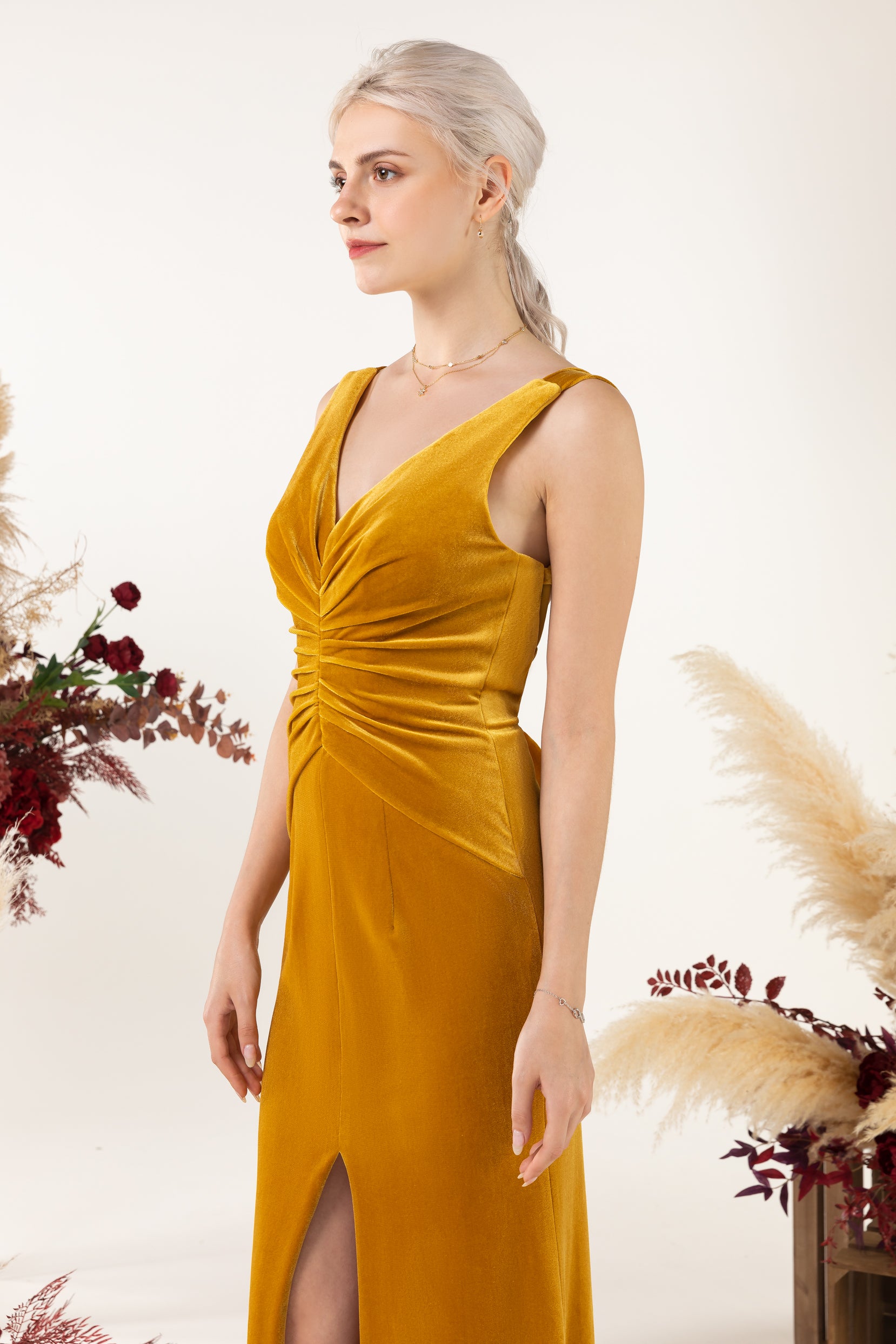 This luxurious velvet bridesmaid dress features a deep, shimmering hue and elegant open back. The V-neck and sleeveless design highlight graceful curves, while the fitted column silhouette and sweeping train create a refined, flowing look with added sophistication and allure.