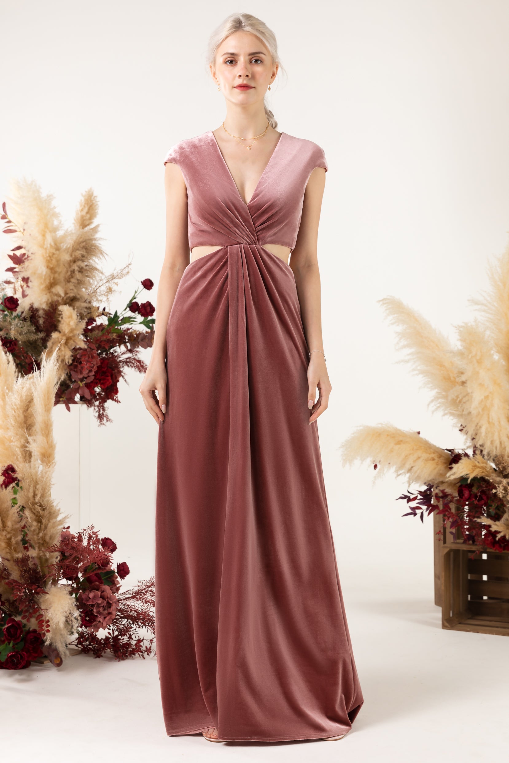 This velvet bridesmaid dress dazzles with its luxurious sheen and deep hues. The V-neck and short sleeves highlight elegance, while the fitted column cut and floor-length train create a graceful silhouette. Hidden zipper and pleated details add sophistication, making it perfect for any formal event.