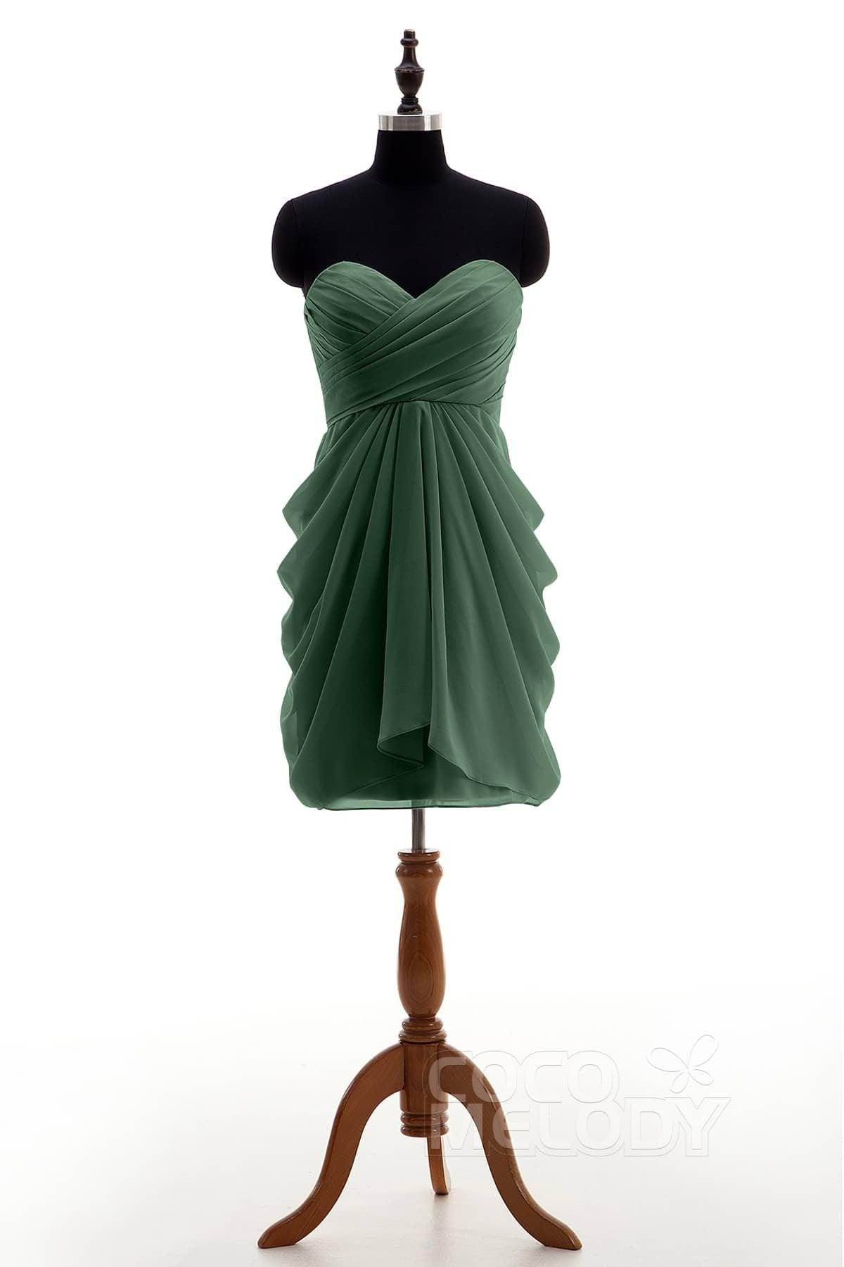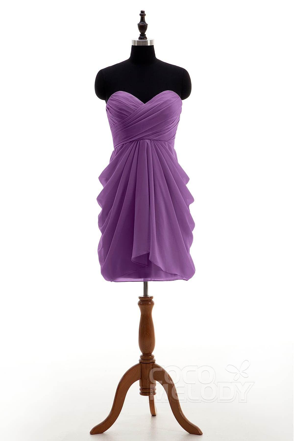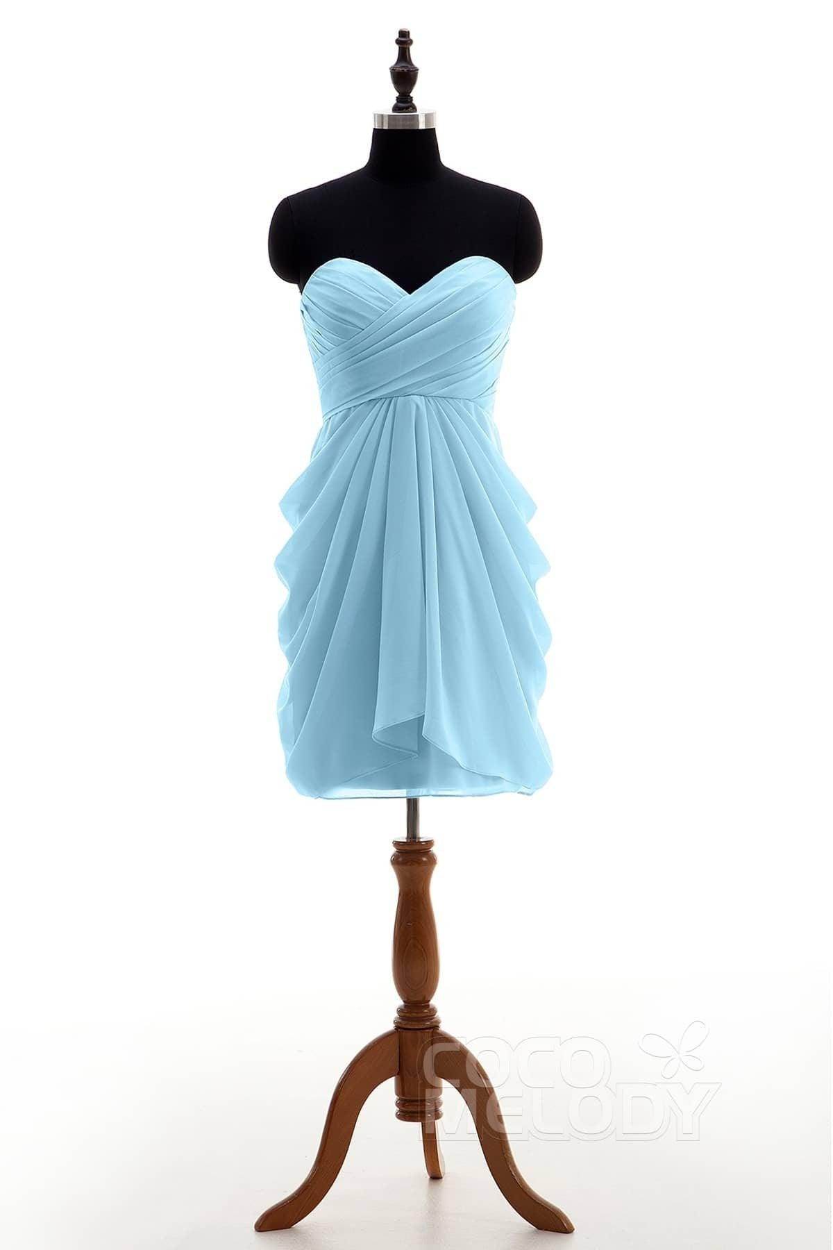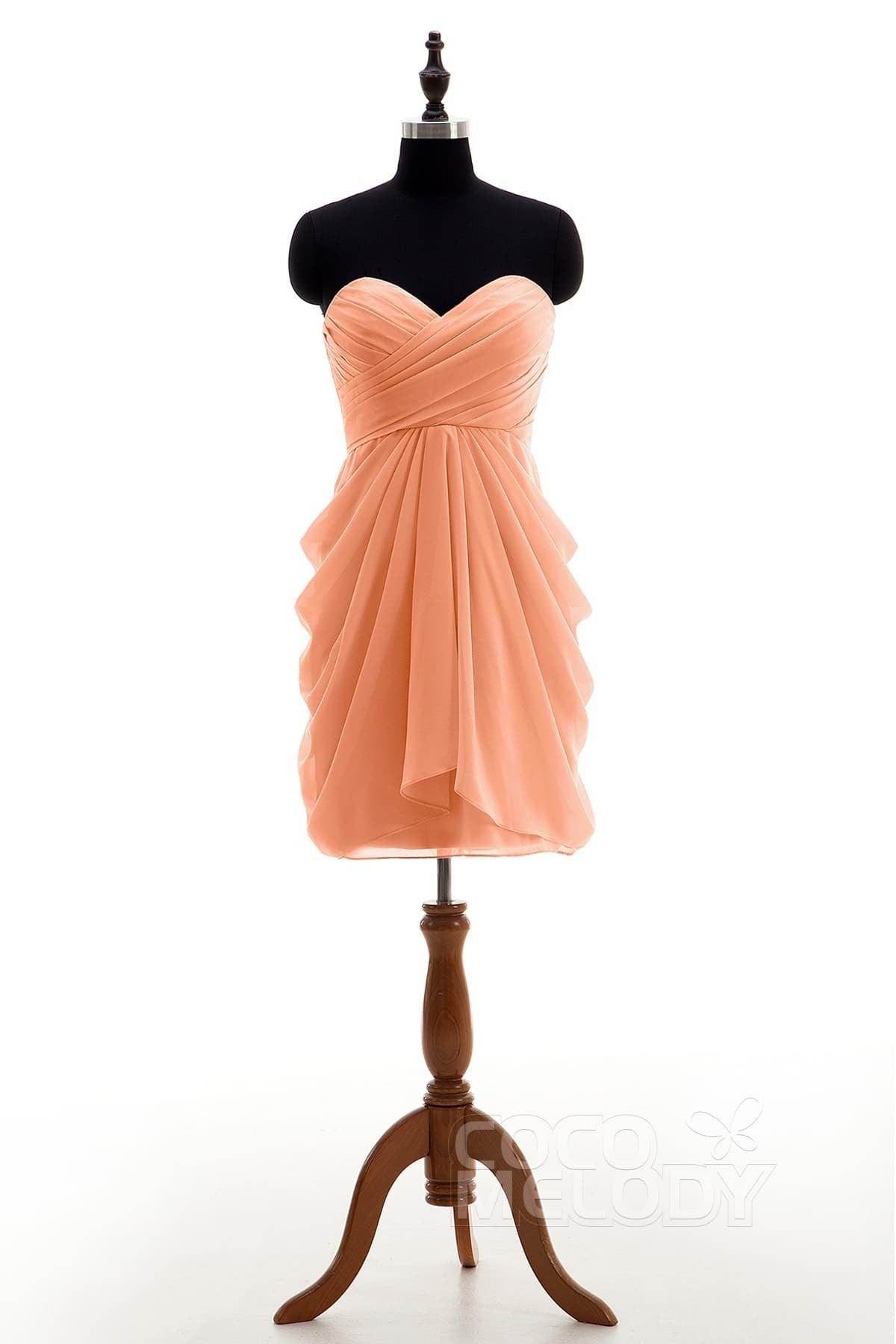 This elegant bridesmaid dress features a hidden zipper back and flowing chiffon fabric with delicate pleating. The knee-length sheath silhouette and sweetheart neckline create a charming, refined look. The sleeveless design and natural waistline enhance its graceful, flattering appeal.