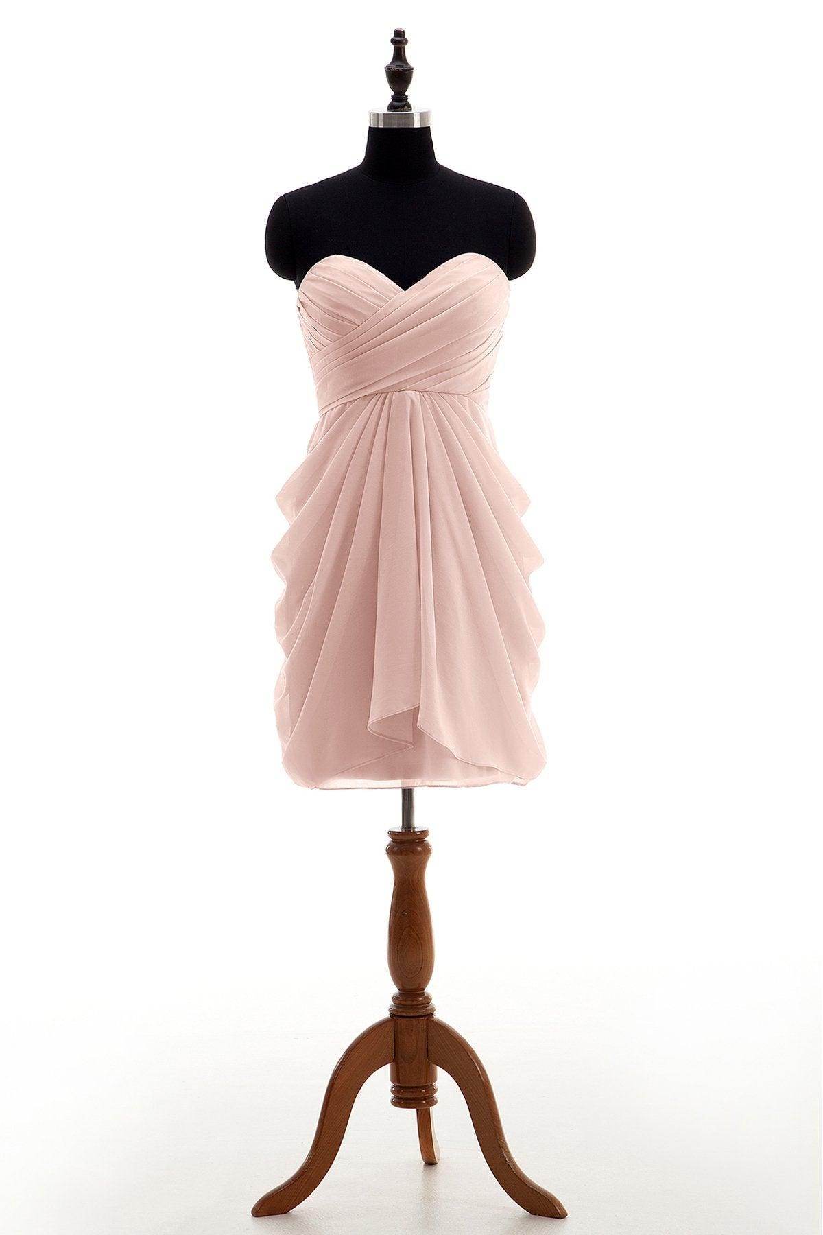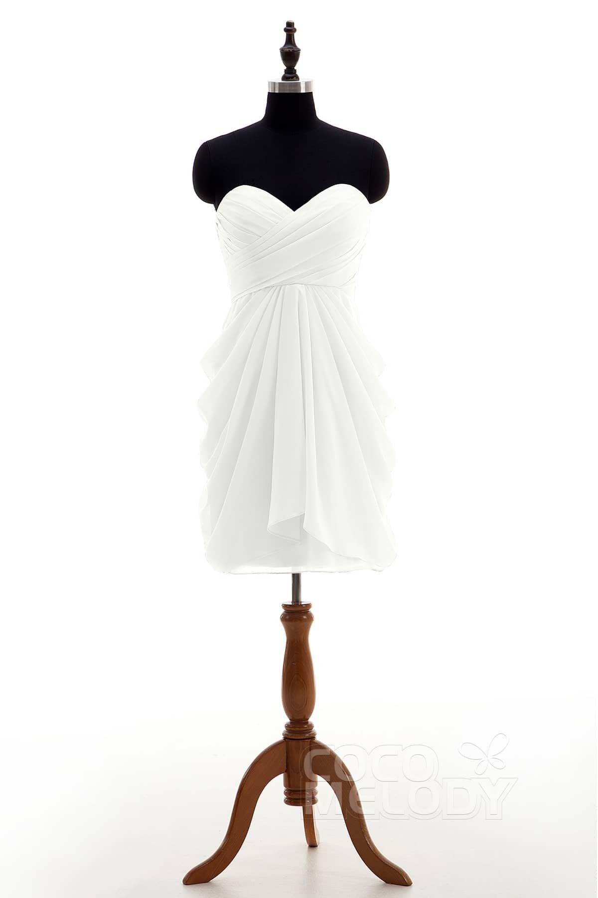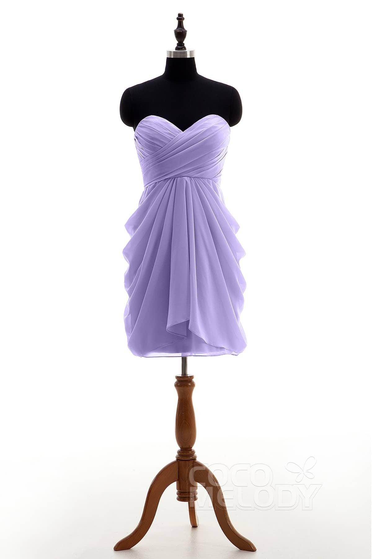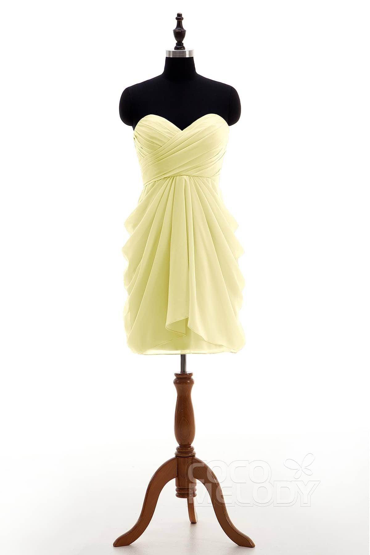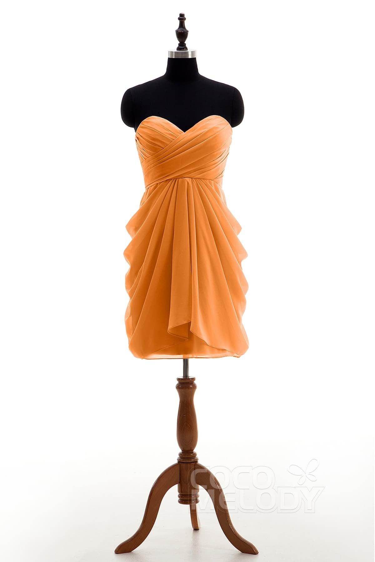 This elegant bridesmaid dress features a hidden zipper back and flowing chiffon fabric with delicate pleating. The knee-length sheath silhouette and sweetheart neckline create a charming, refined look. The sleeveless design and natural waistline enhance its graceful, flattering appeal.