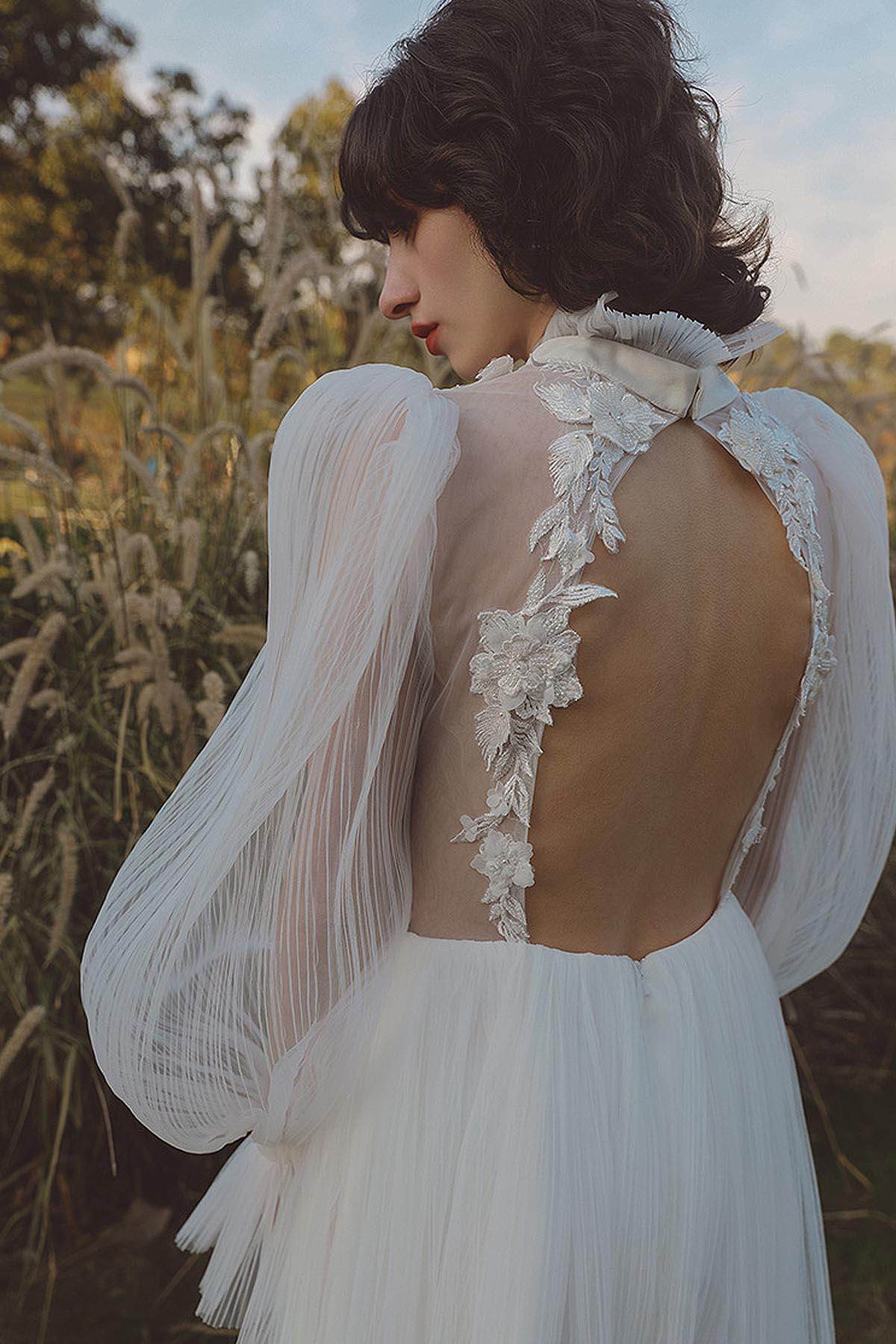 Exude elegance in the RENEE wedding dress by Anne Blanche. This exquisite ivory sheath-column gown features a chic high neck, long sleeves, and beautiful appliqués with beading. Perfect for halls, gardens, or receptions, its customizable design and knee-length hem ensure a sophisticated look for your special day!