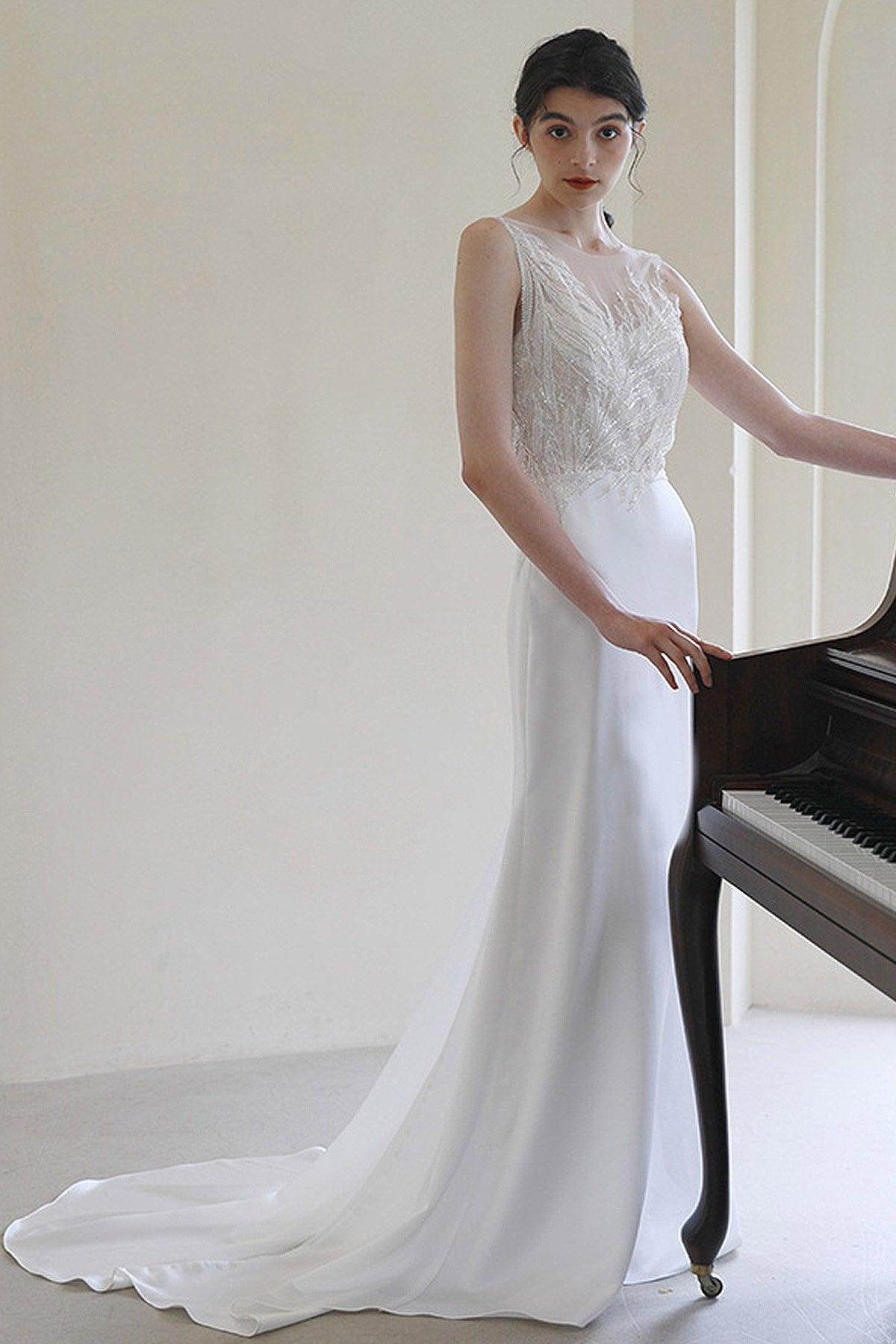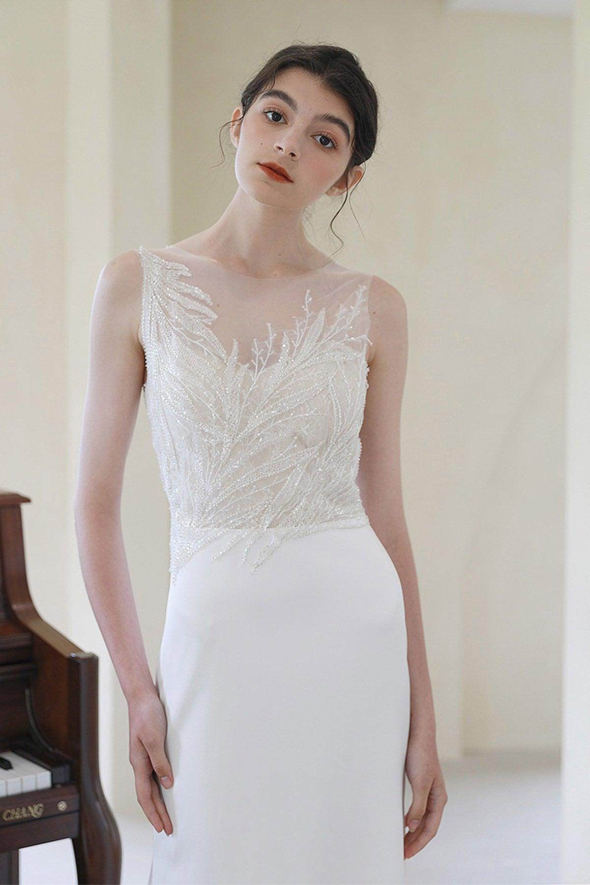 Step into sophistication with the SPENCER wedding dress by Anne Blanche. This exquisite ivory sheath-column gown features a captivating illusion neckline and sleeveless design. Ideal for beach or garden weddings, its customizable fit and sweep-brush train will make your special day unforgettable!