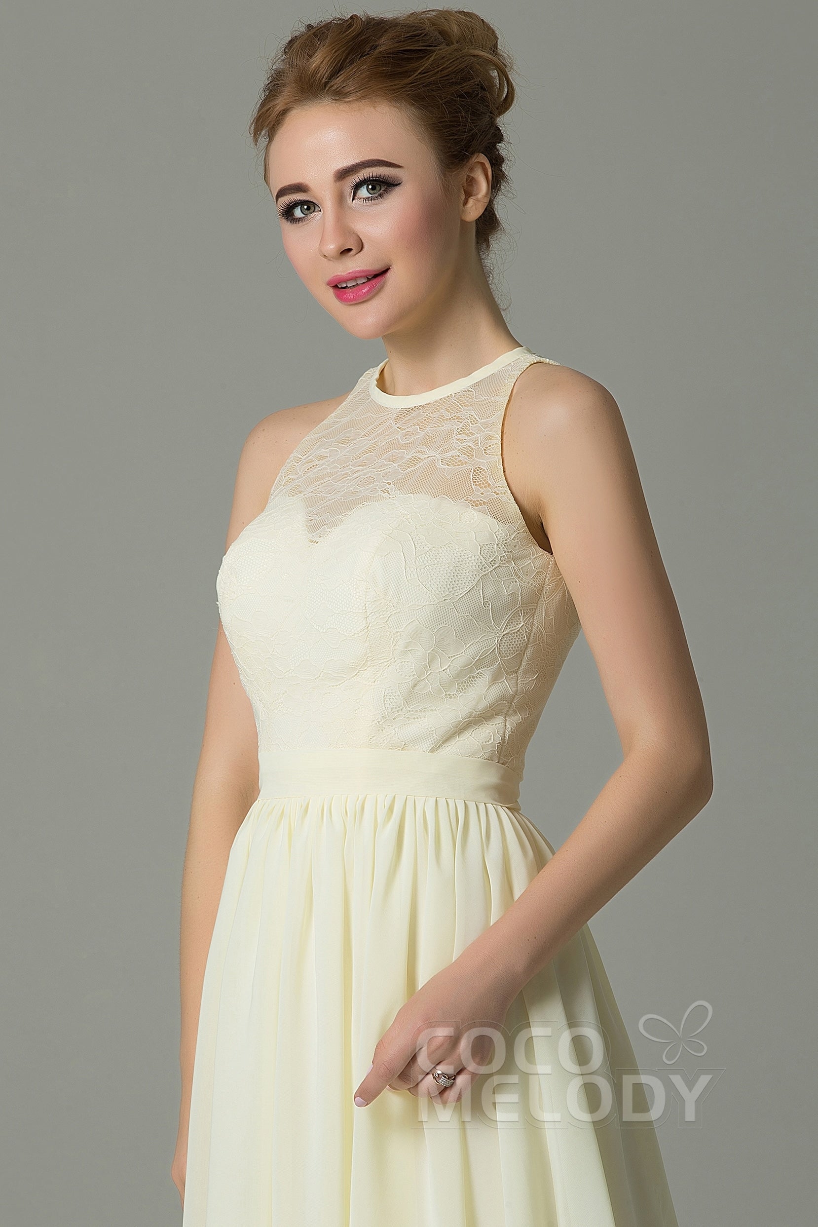 This bridesmaid dress combines elegant lace and airy chiffon for a sophisticated look. The knee-length A-line silhouette flows gracefully, while the illusion neckline and sleeveless design highlight your shoulders. A natural waist and detachable sash add a touch of versatility. A back zipper ensures a perfect fit.