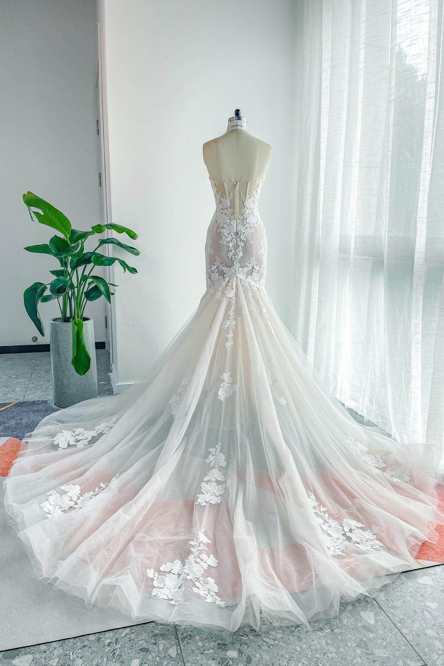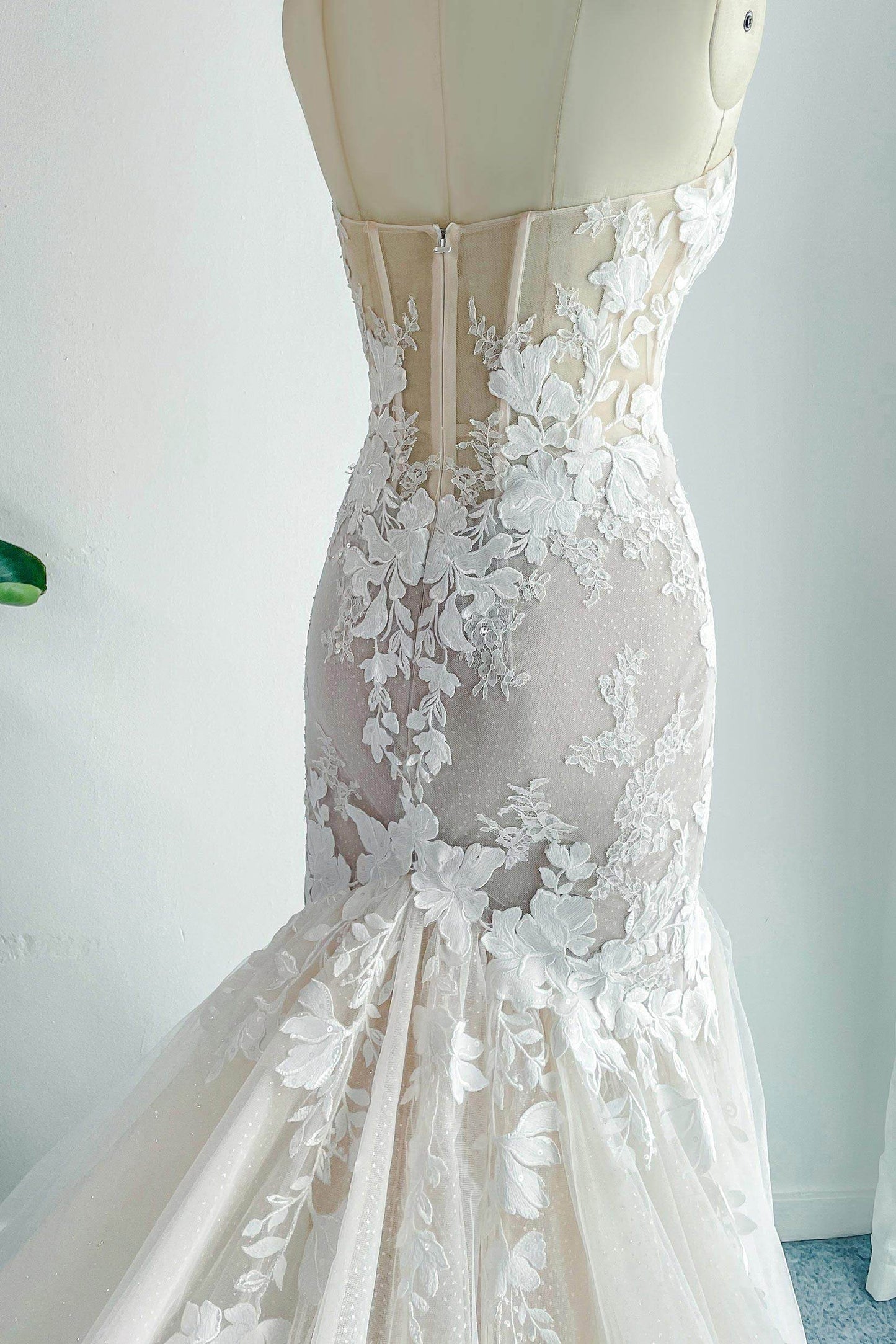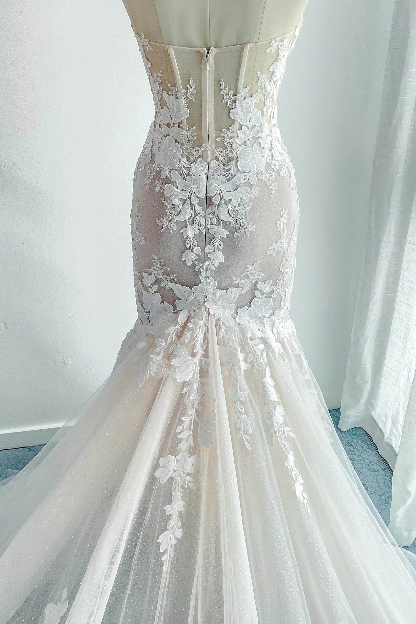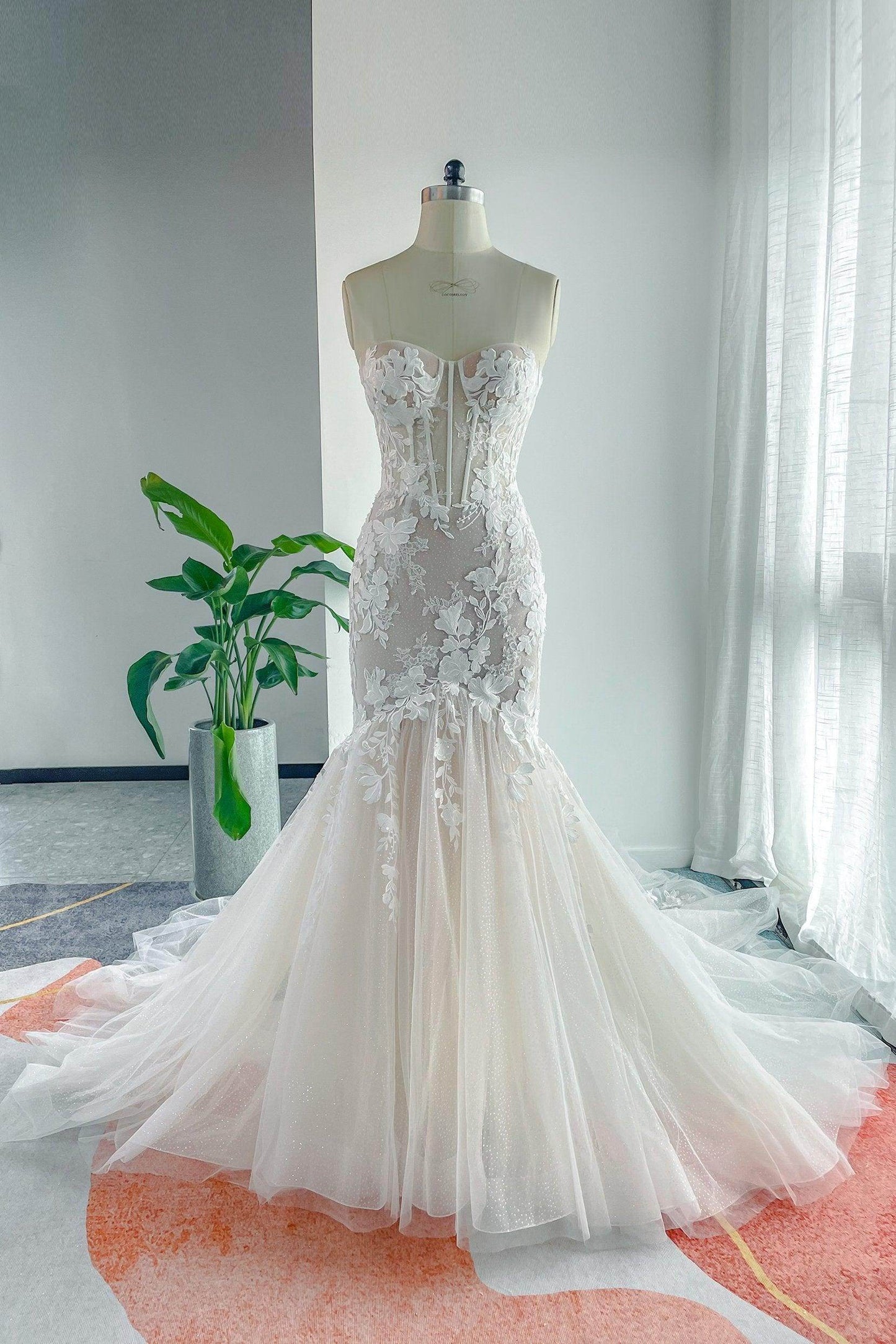 Introducing the Denver wedding dress—an elegant ivory/nude gown with exquisite appliques, a sweetheart neckline, and detachable puff sleeves, perfect for hotel, church, garden, and hall weddings!