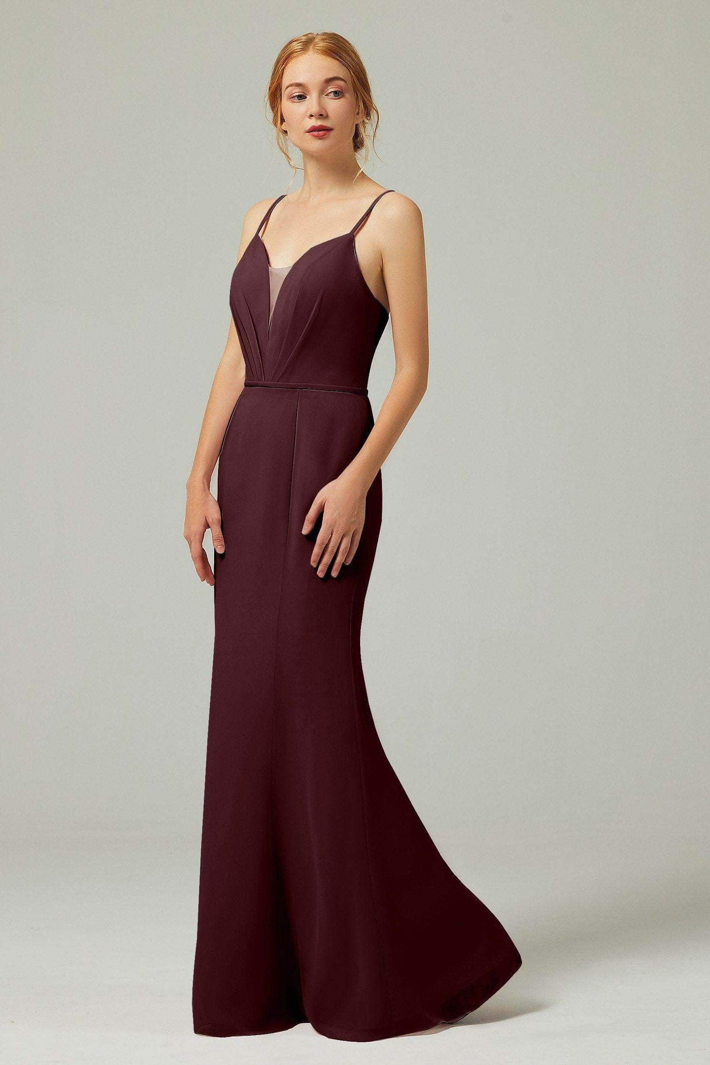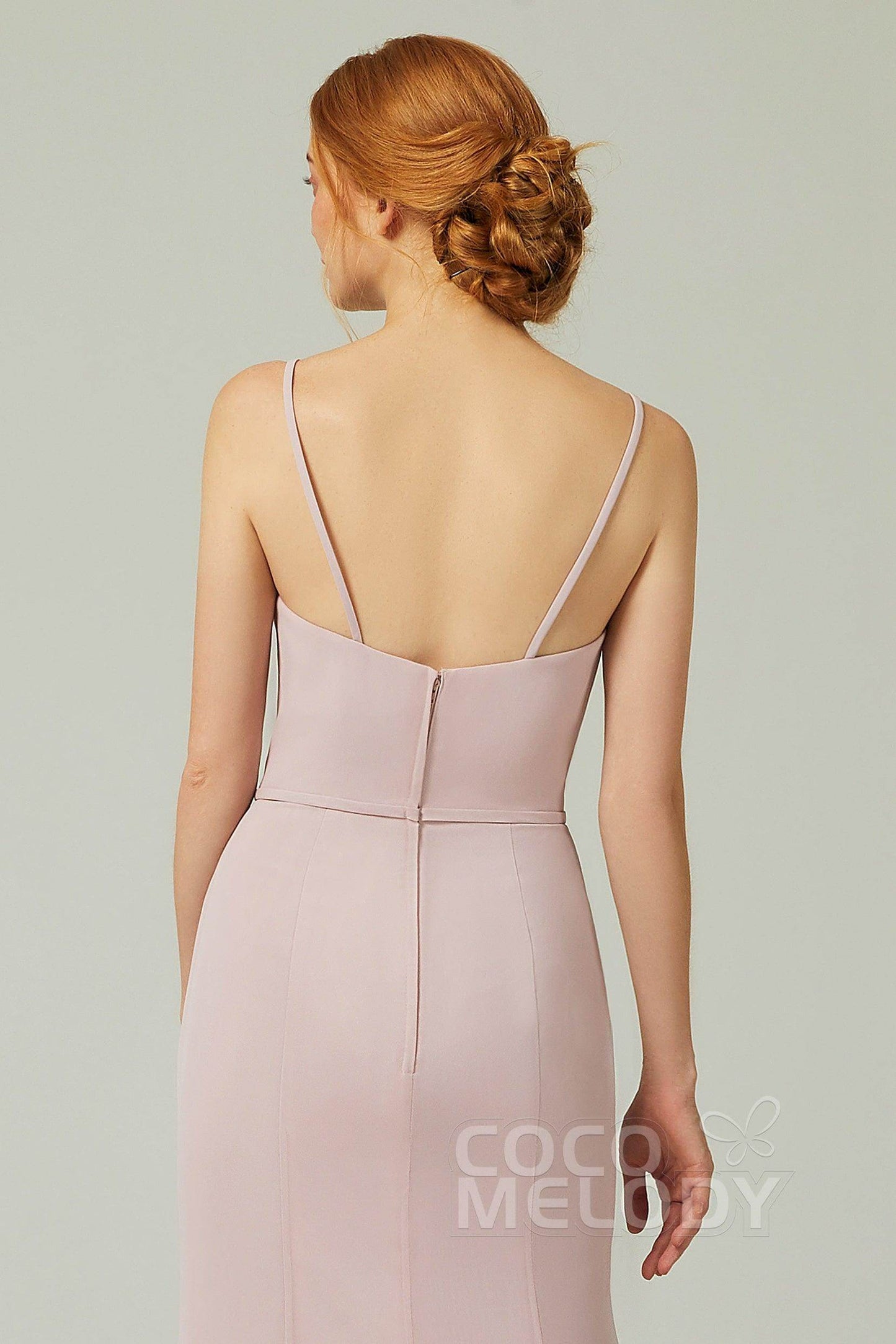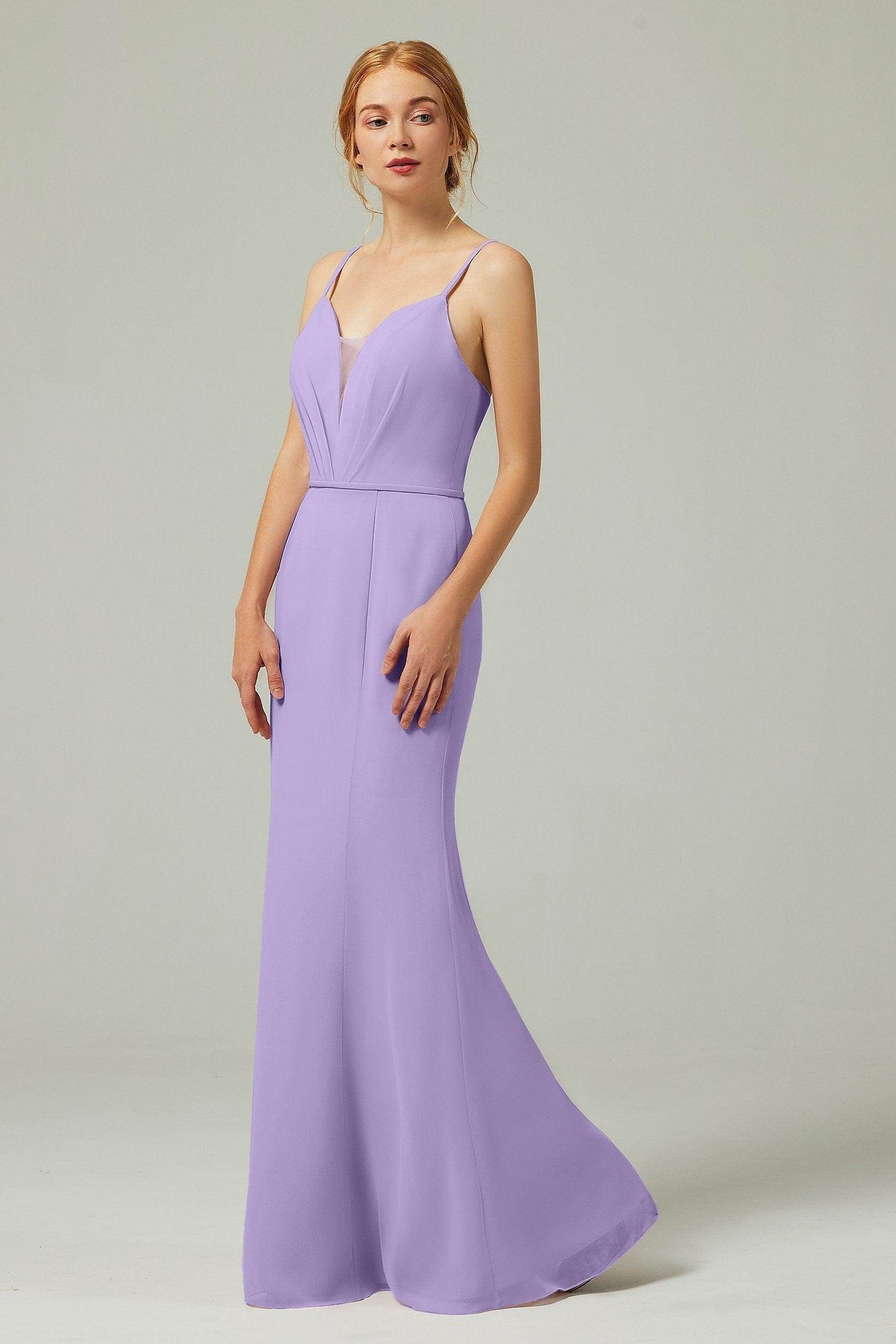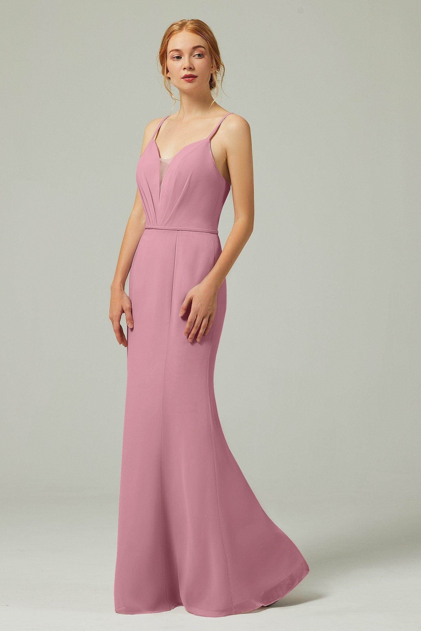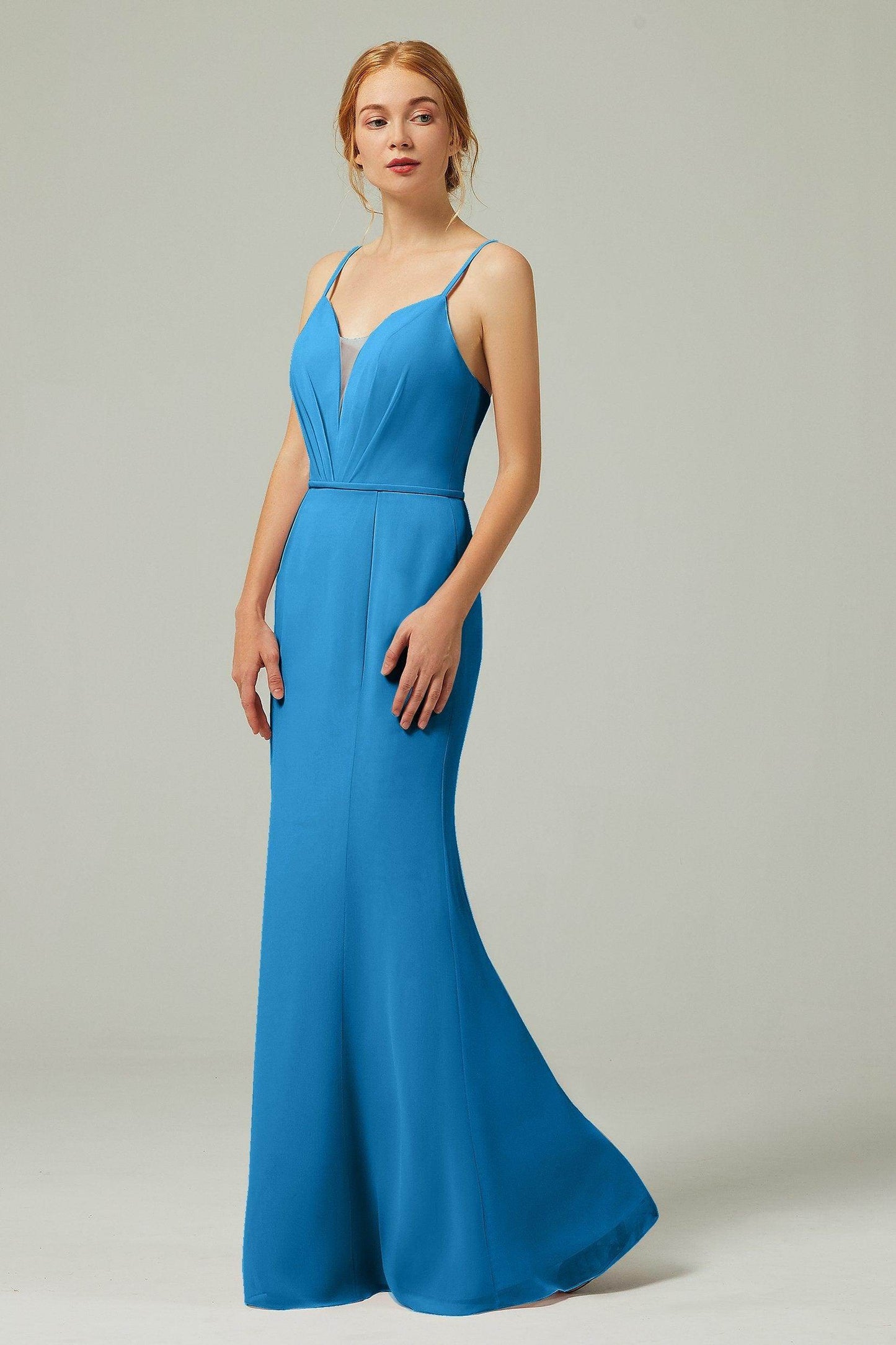 This exquisite bridesmaid gown features lightweight chiffon that elegantly flows to the floor in a stunning trumpet-mermaid silhouette. Delicate spaghetti straps highlight the shoulders, while beautiful pleating and sashes add a touch of charm. Perfect for any formal occasion!