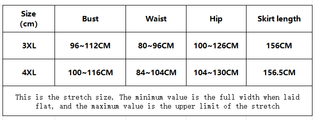 XXXXL(4XL) : Bust: 100-116cm Waist: 84-104cm Hip: 104-130cm Skirt length: 156.5cm