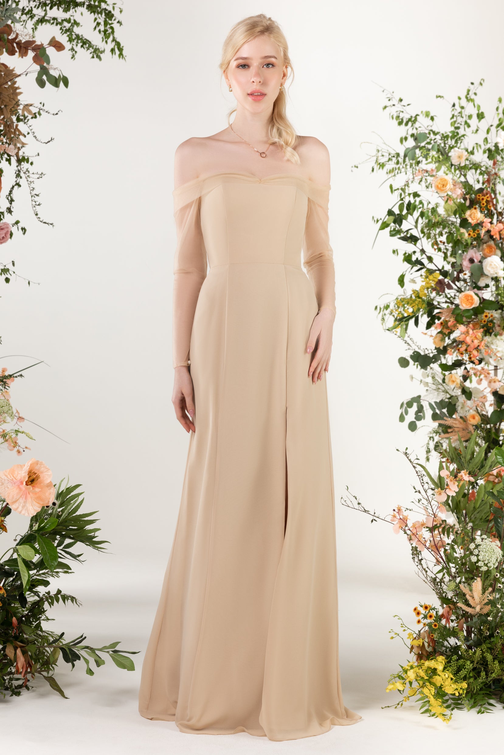 This bridesmaid dress merges modern elegance with classic charm. The off-shoulder neckline and long sleeves add sophistication, while the chiffon fabric flows gracefully. The trumpet skirt and natural waist enhance your curves, and the sweep train adds a touch of romance.