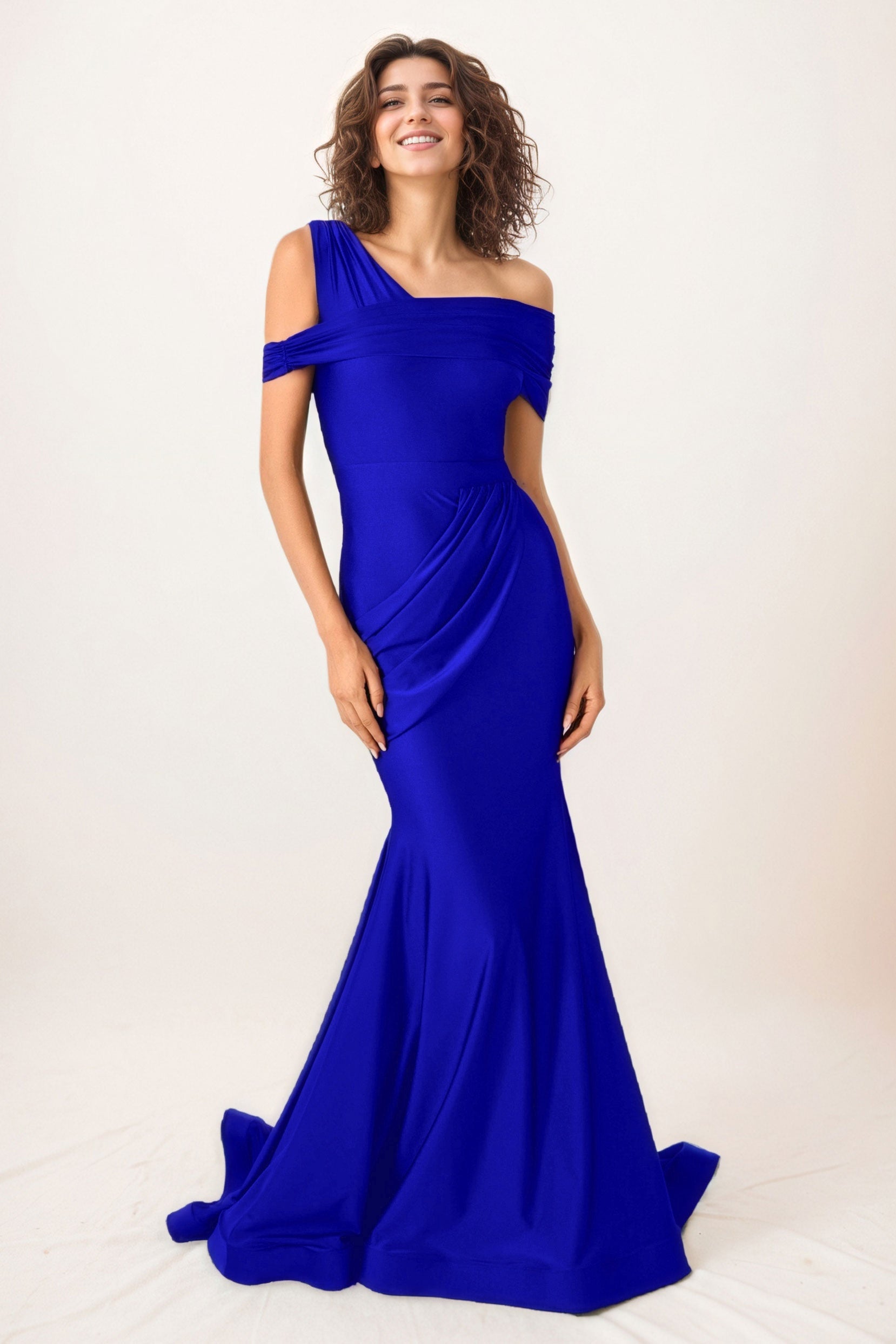 This stunning trumpet-mermaid wedding guest dress features a one-shoulder design with off-the-shoulder sleeves and a sweep-brush train. Crafted from stretch satin with a zipper closure, it’s perfect for elegant evening weddings.