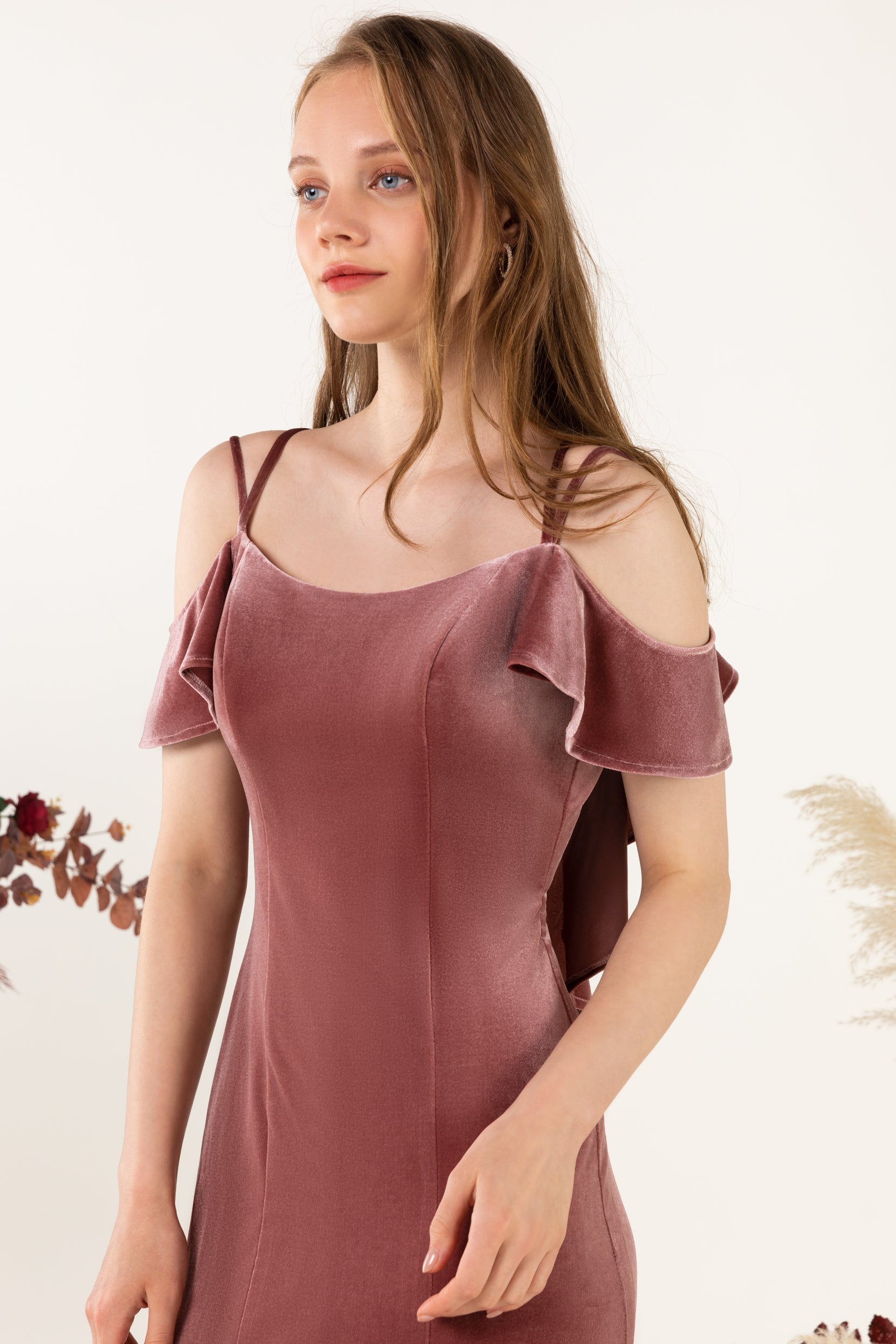 This velvet bridesmaid dress exudes luxury with its rich sheen and deep hues. The V-neck and sleeveless design highlight elegance, while the trumpet skirt and floor-length train create a graceful silhouette. Hidden zipper and ruffle details add charm and sophistication, perfect for any formal event.