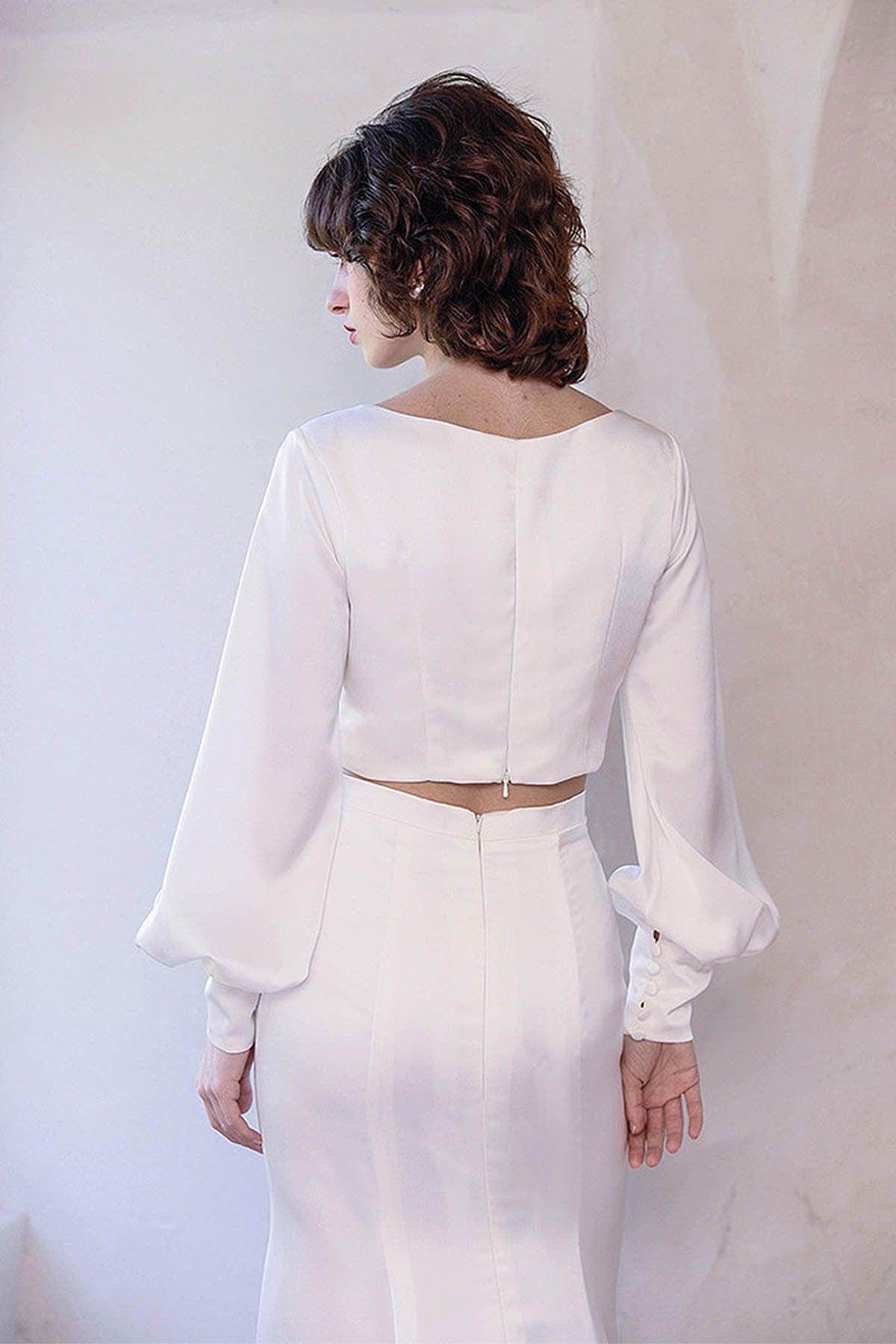 Elevate your wedding look with the AYANNA two-piece dress by Anne Blanche. This elegant ivory gown features a V-neck, playful puff sleeves, and beautiful pleating. Perfect for beach or garden weddings, its customizable design and sweep-brush train will make your day is unforgettable!