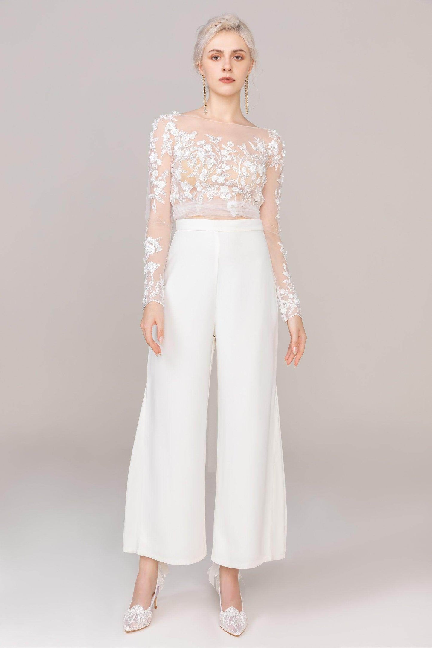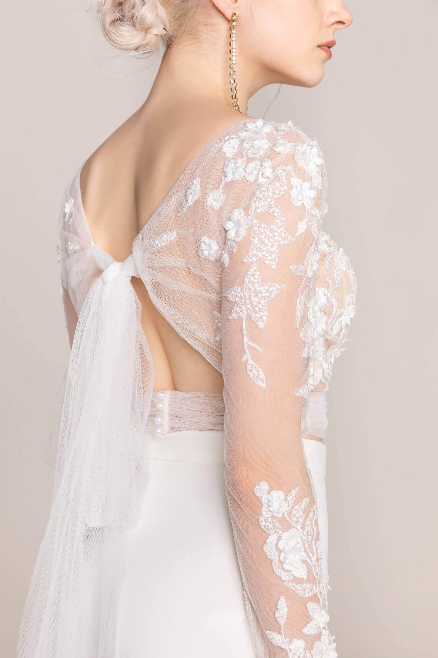 Introducing the KYRA wedding dress—a beautiful blend of minimalist elegance in ivory and nude. This chic two-piece gown features a bateau neckline, lovely appliqués, and long sleeves. Perfect for hotel, church, beach, or hall weddings, it radiates grace and sophistication!