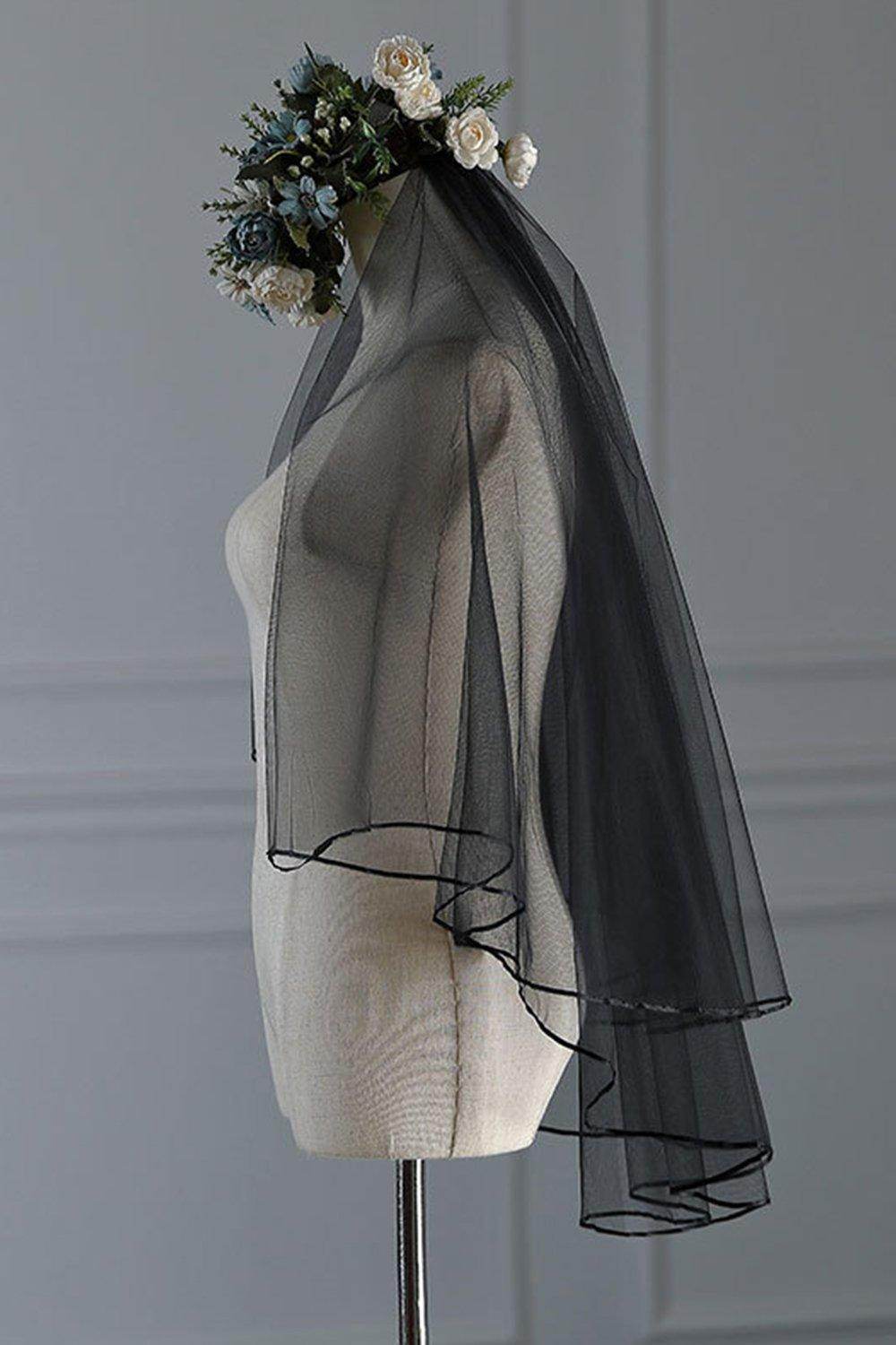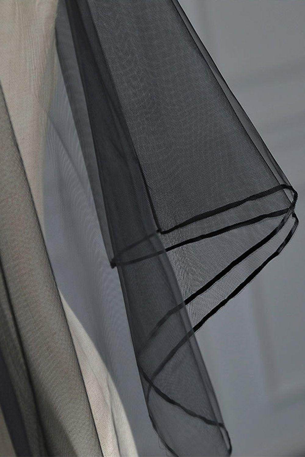 This charming two-tier ribbon edge hip veil, made of tulle, is perfect for brides seeking a stylish and modern accessory for their wedding day.