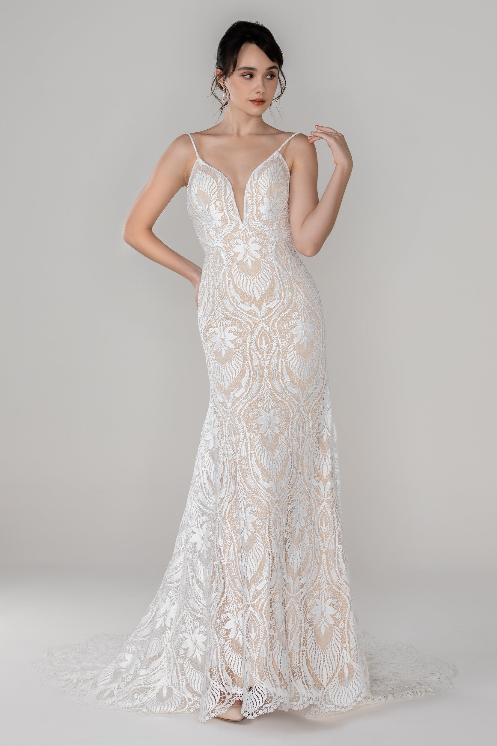 Introducing the MARGO wedding dress—an exquisite ivory/nude gown crafted from lace. With a V-neck, delicate appliques, and a stylish zipper with buttons, this sleeveless trumpet silhouette is perfect for any venue. Customize your vintage-inspired look for an unforgettable day!